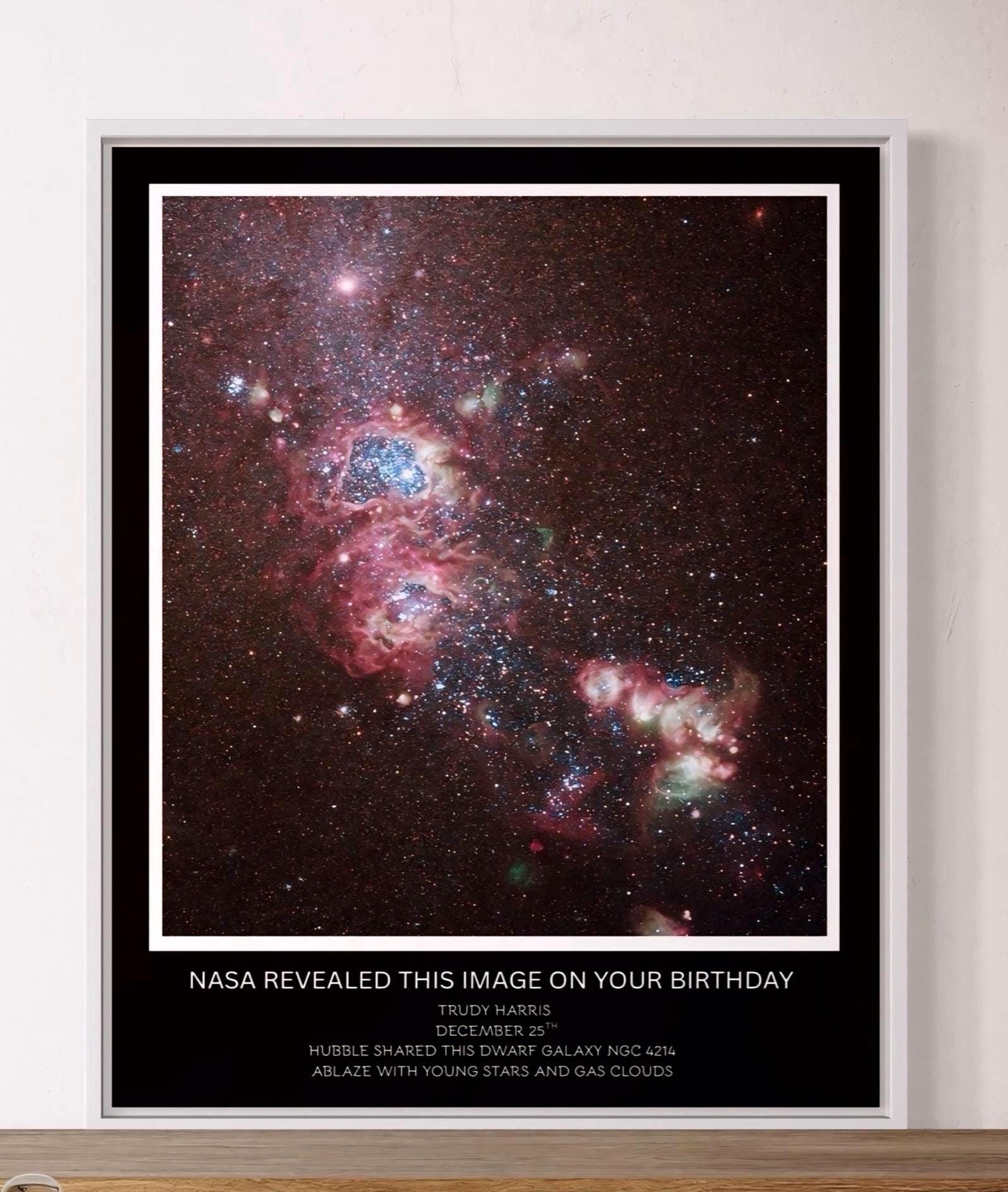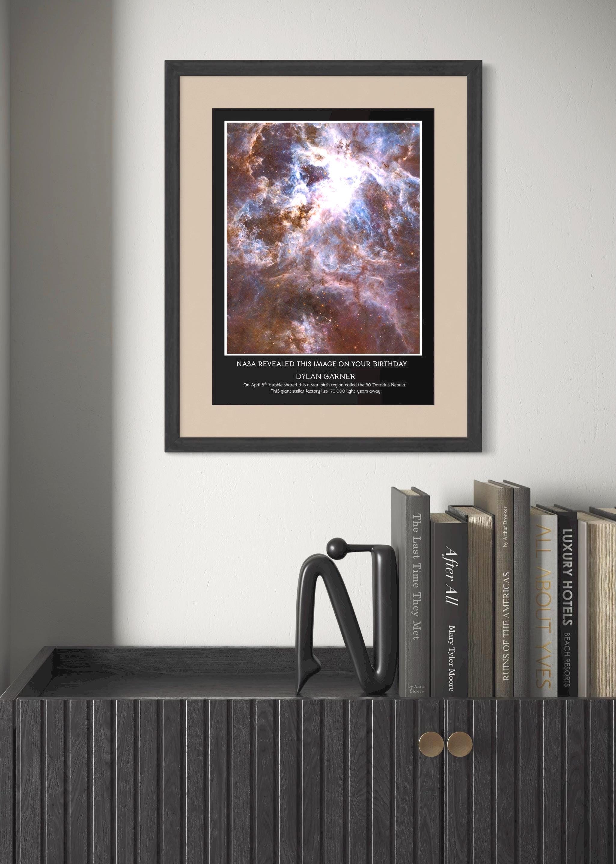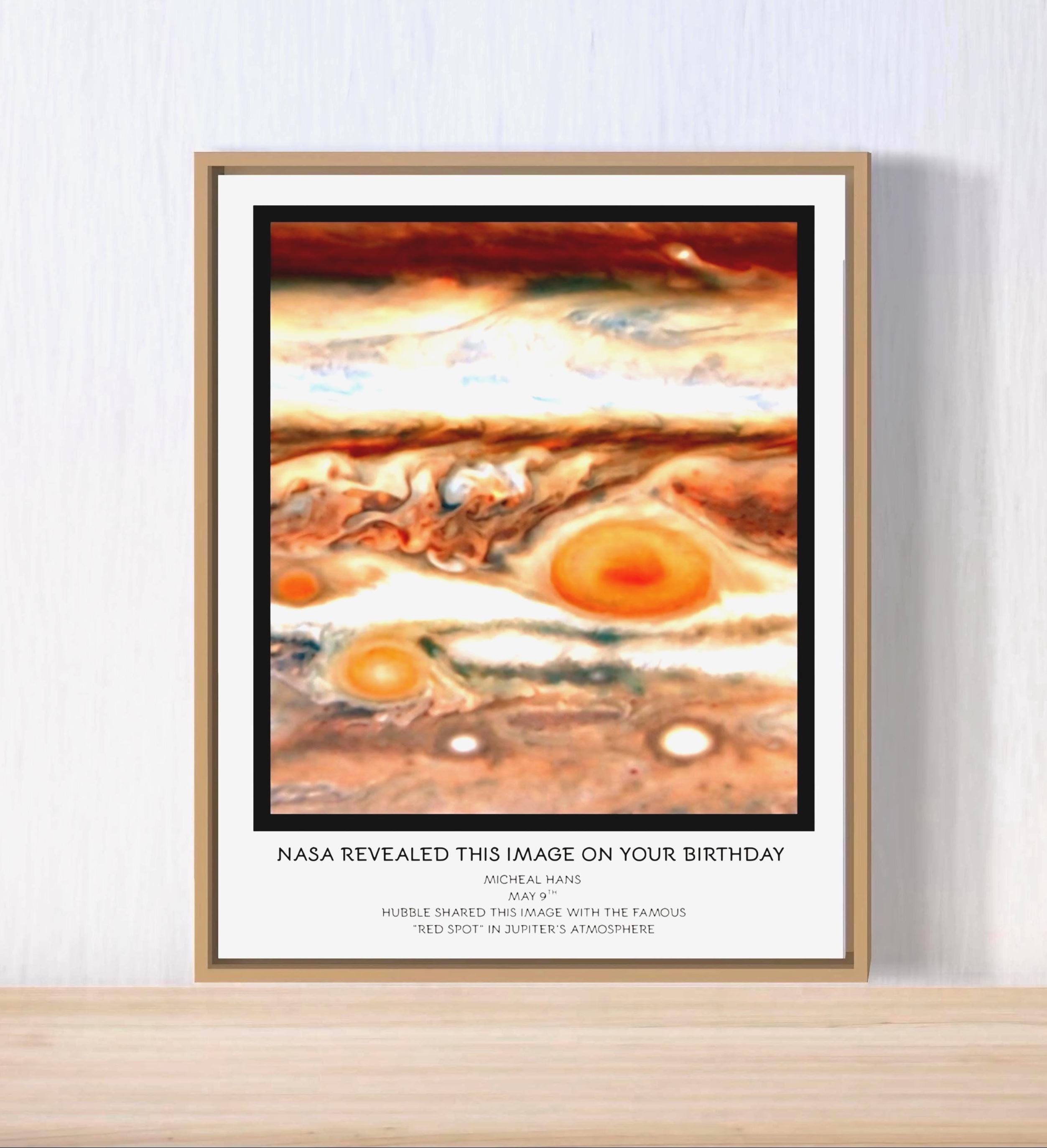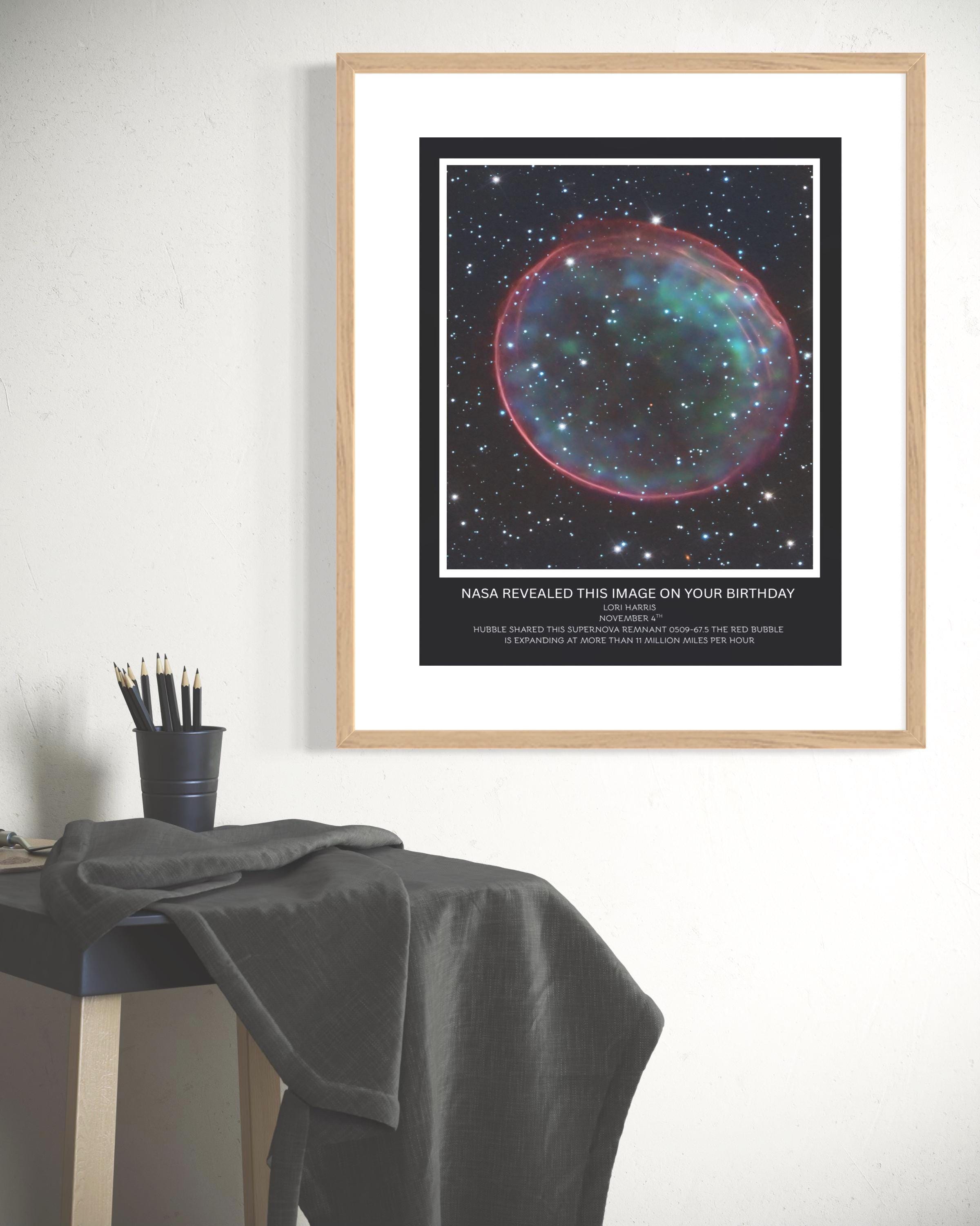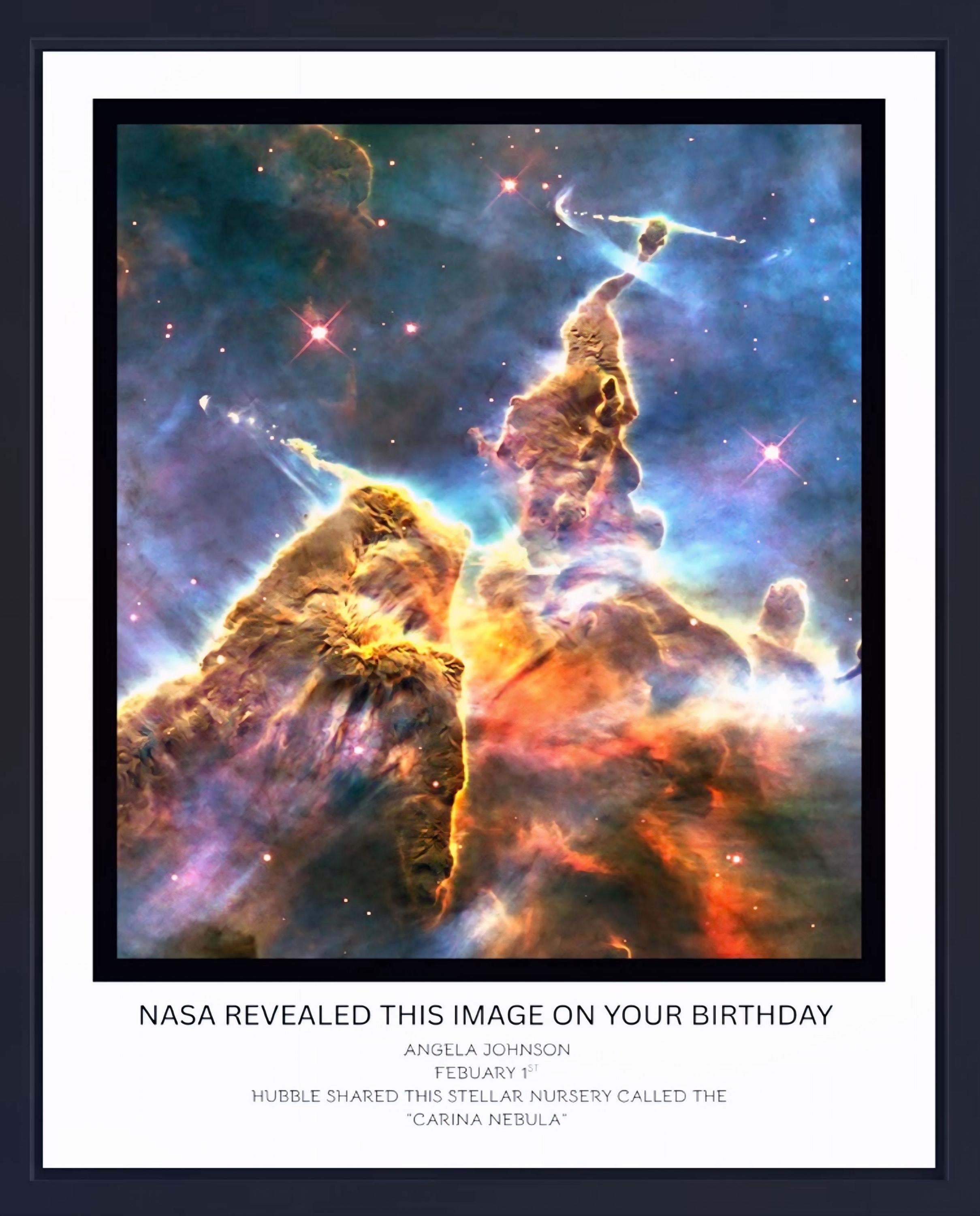 Each day, NASA releases a different image from the Hubble Space Telescope. I match your chosen day and month with the exact image Hubble released on that date. I’ll send you a proof with your custom text/names and the image for approval before printing.