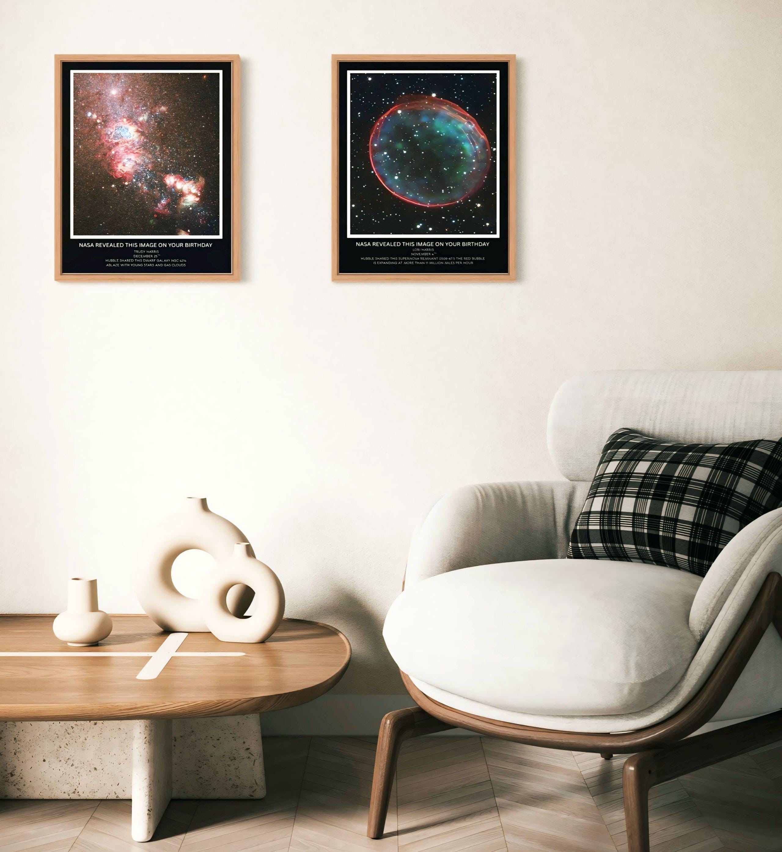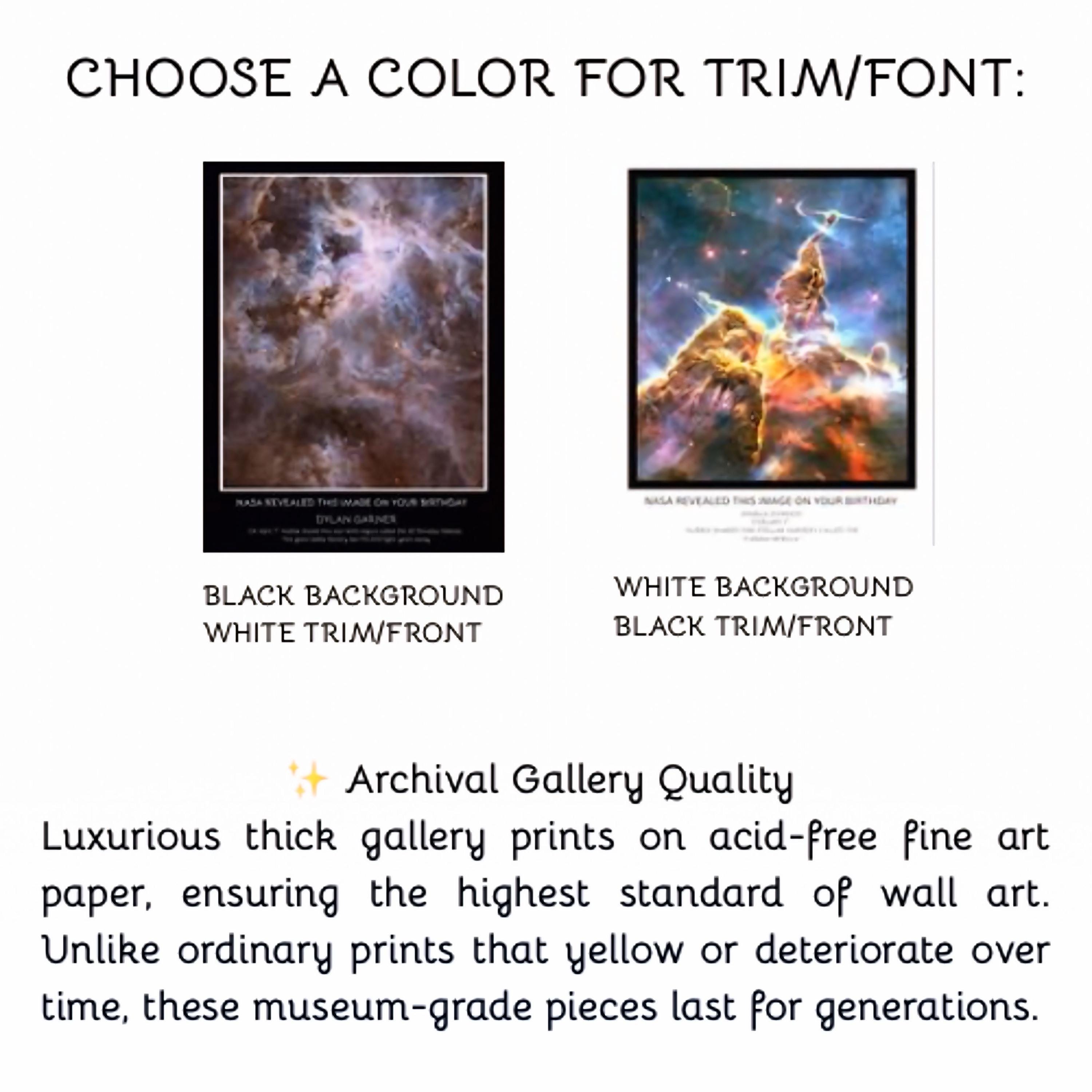 Turn your special day into artwork that captures the beauty and wonder of the universe. This custom print features the image captured by NASA’s JWST and or the Hubble Space Telescope on your chosen date. Whether it’s a birthday, anniversary, or life milestone, your special moment is turned into artwork that is truly one-of-a-kind gift or personal keepsake.