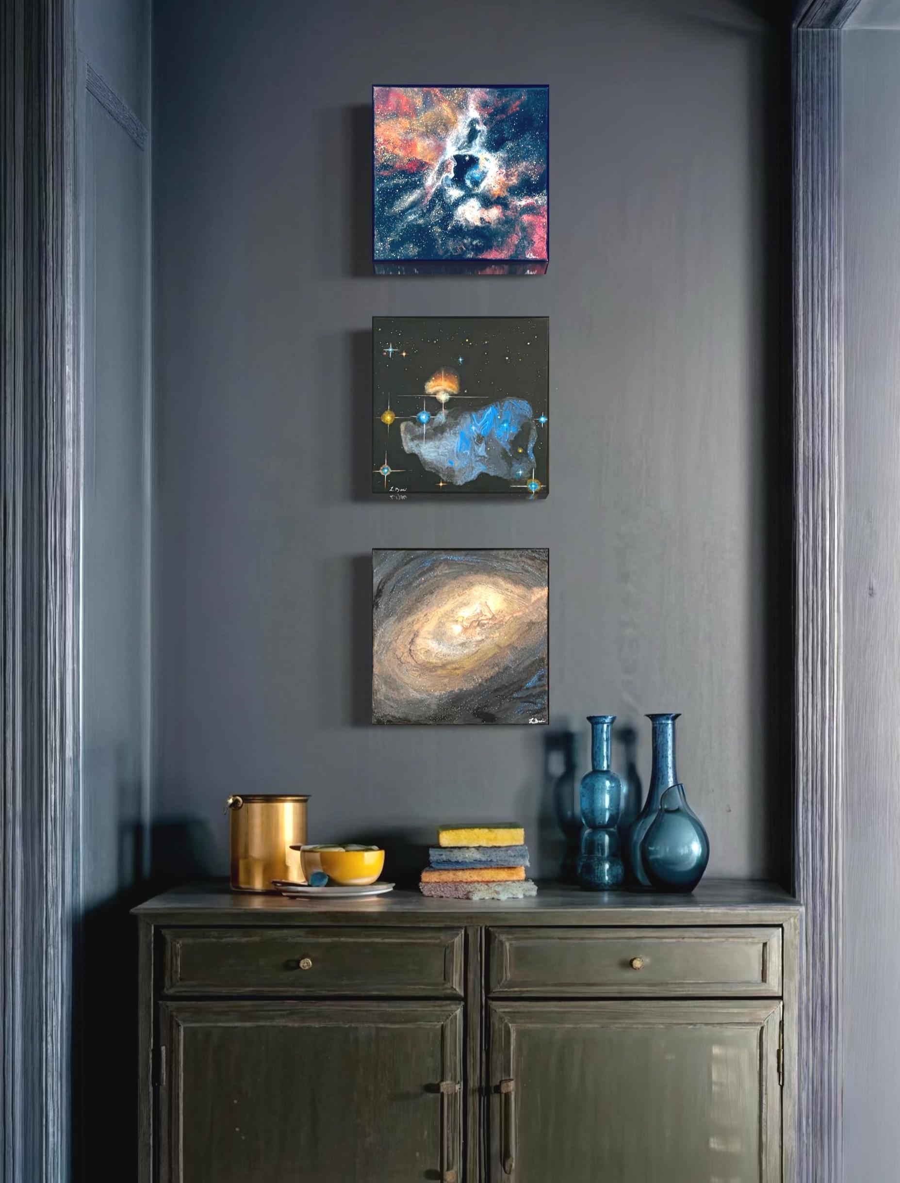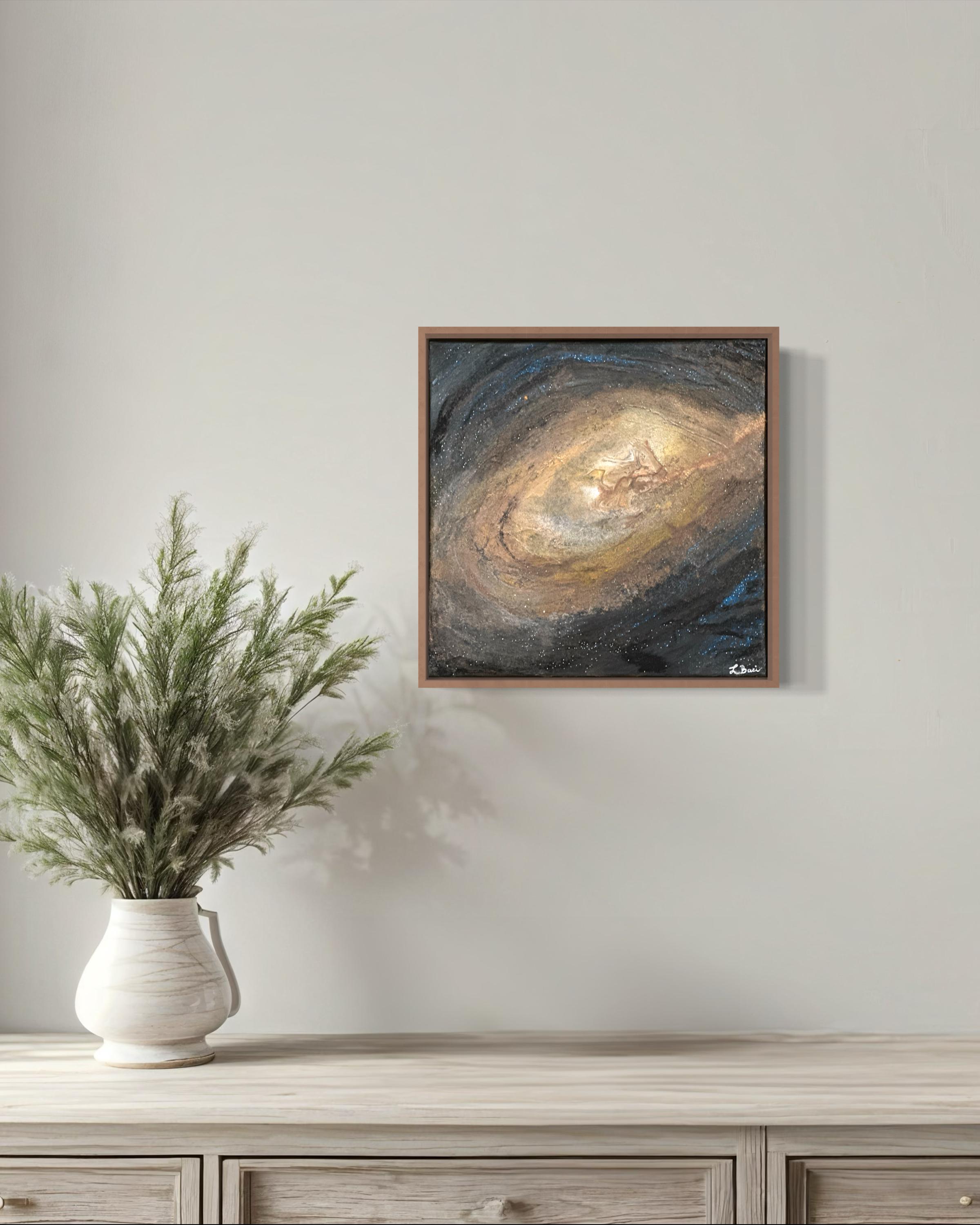 Bring the cosmos into your space with this hand-painted art print inspired by NASA and the James Webb Space Telescope. NGC 3887, a barred spiral galaxy 60 million light-years away, is reimagined as an abstract landscape where color, texture, and light reflect both science and spirit.