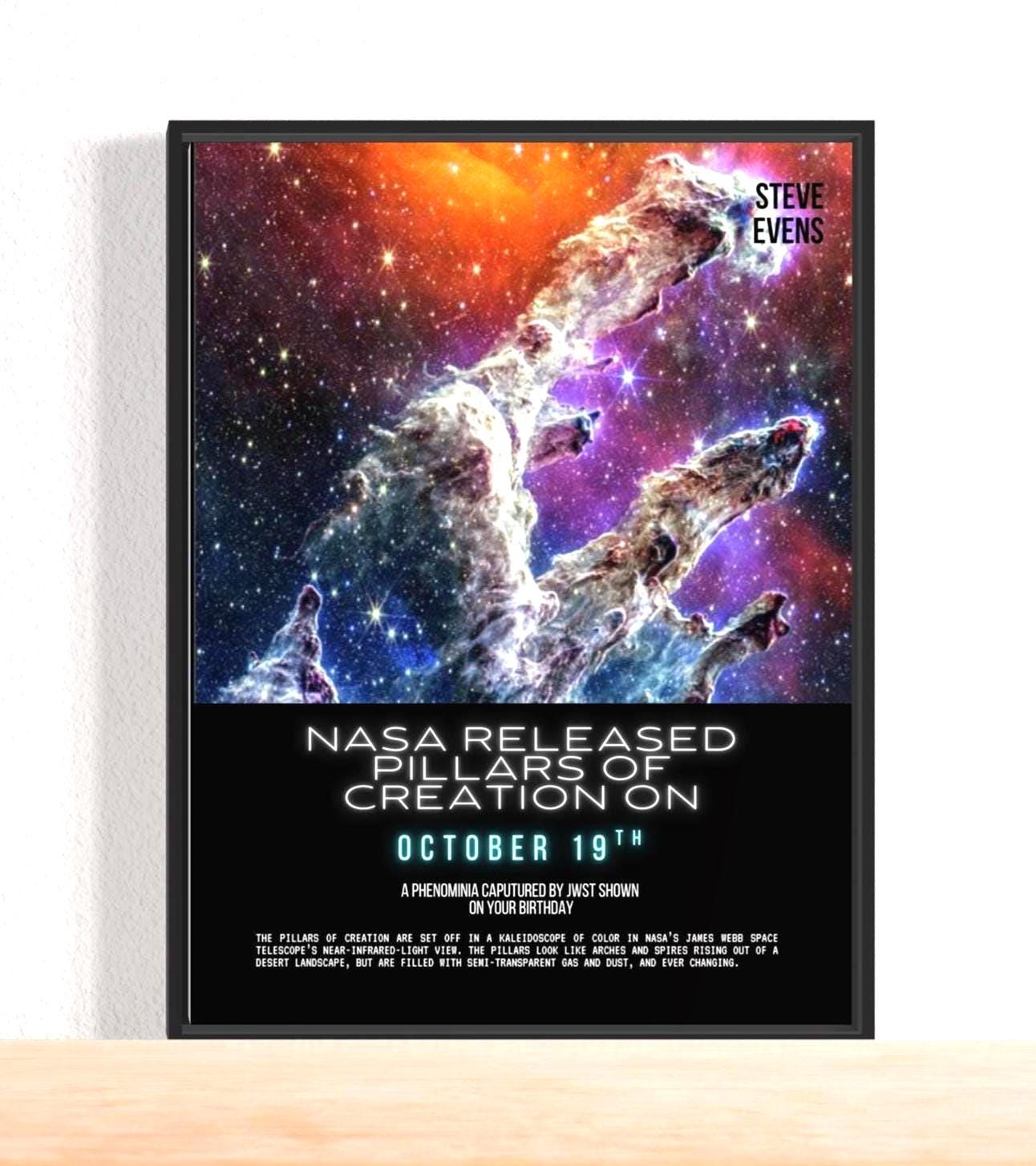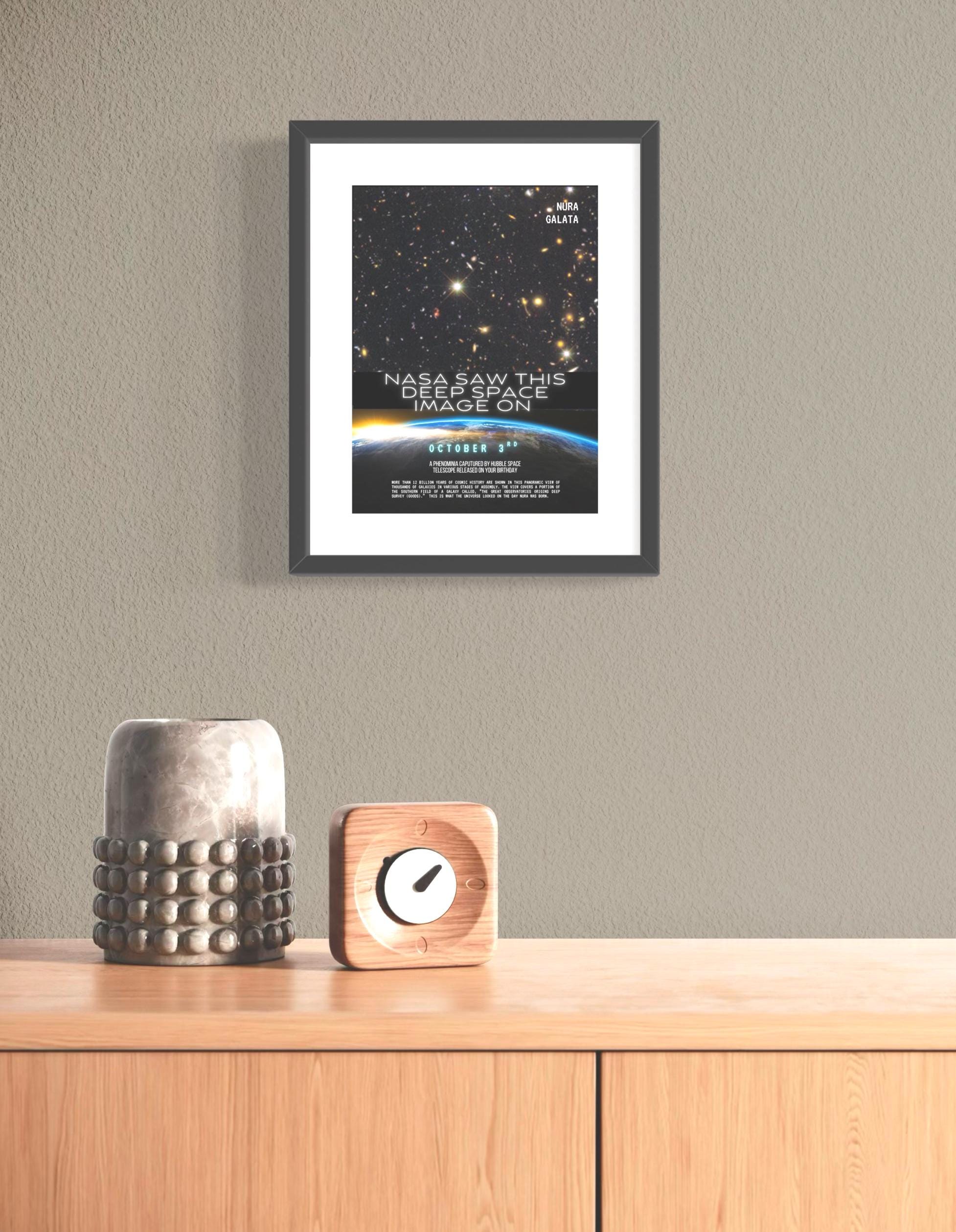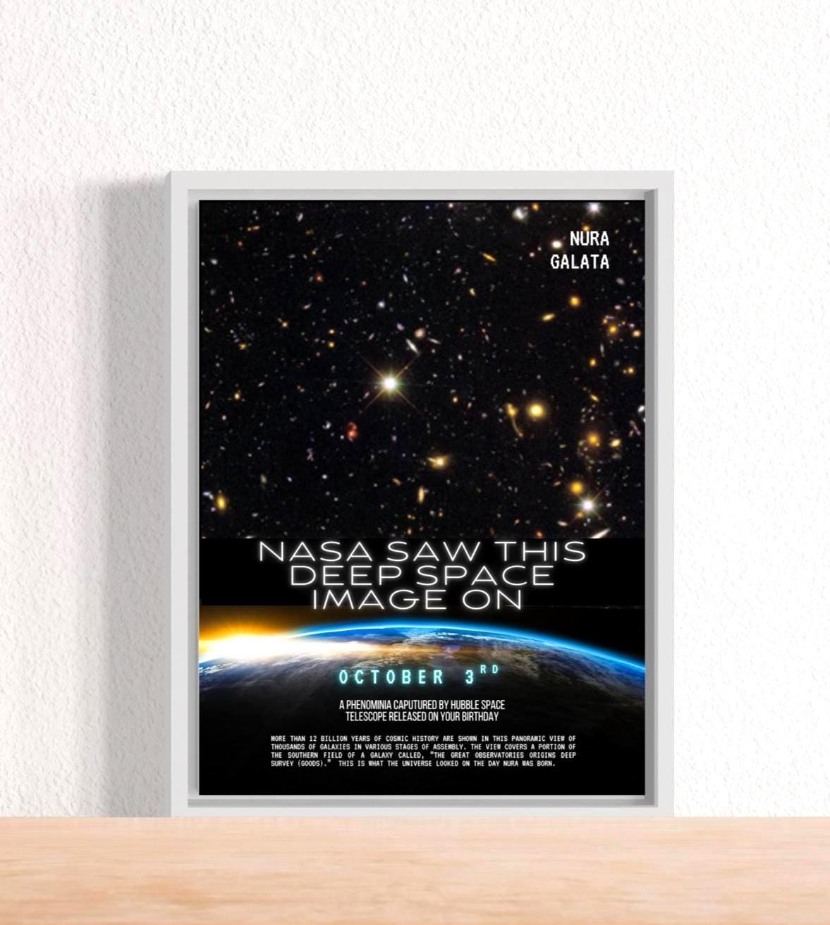 ✨ Turn your special day into artwork that captures the beauty and wonder of the universe. This custom print features the image captured by NASA’s Hubble Space Telescope on your chosen date. Whether it’s a birthday, anniversary, or life milestone, your special moment is turned into artwork that is truly one-of-a-kind gift or personal keepsake.