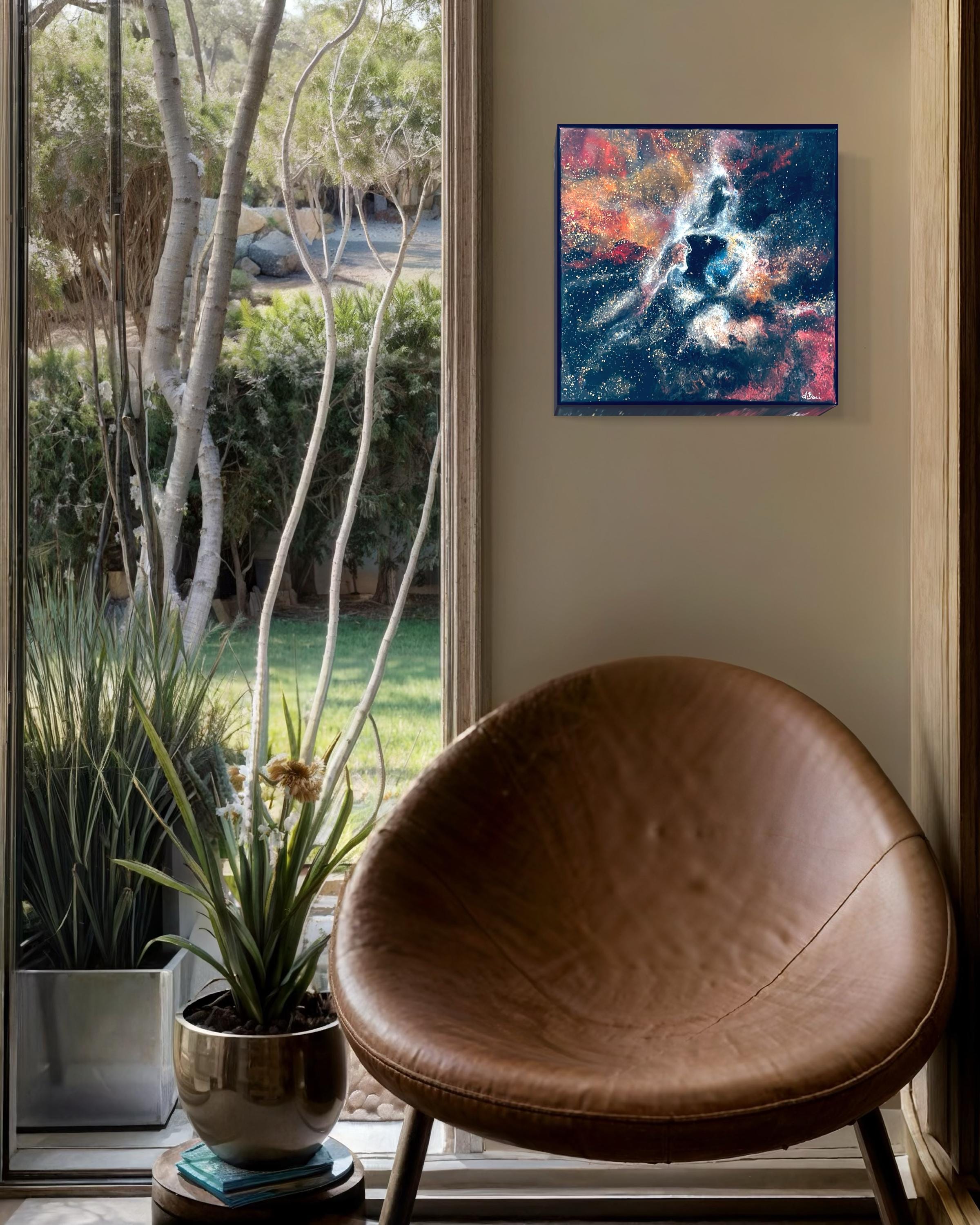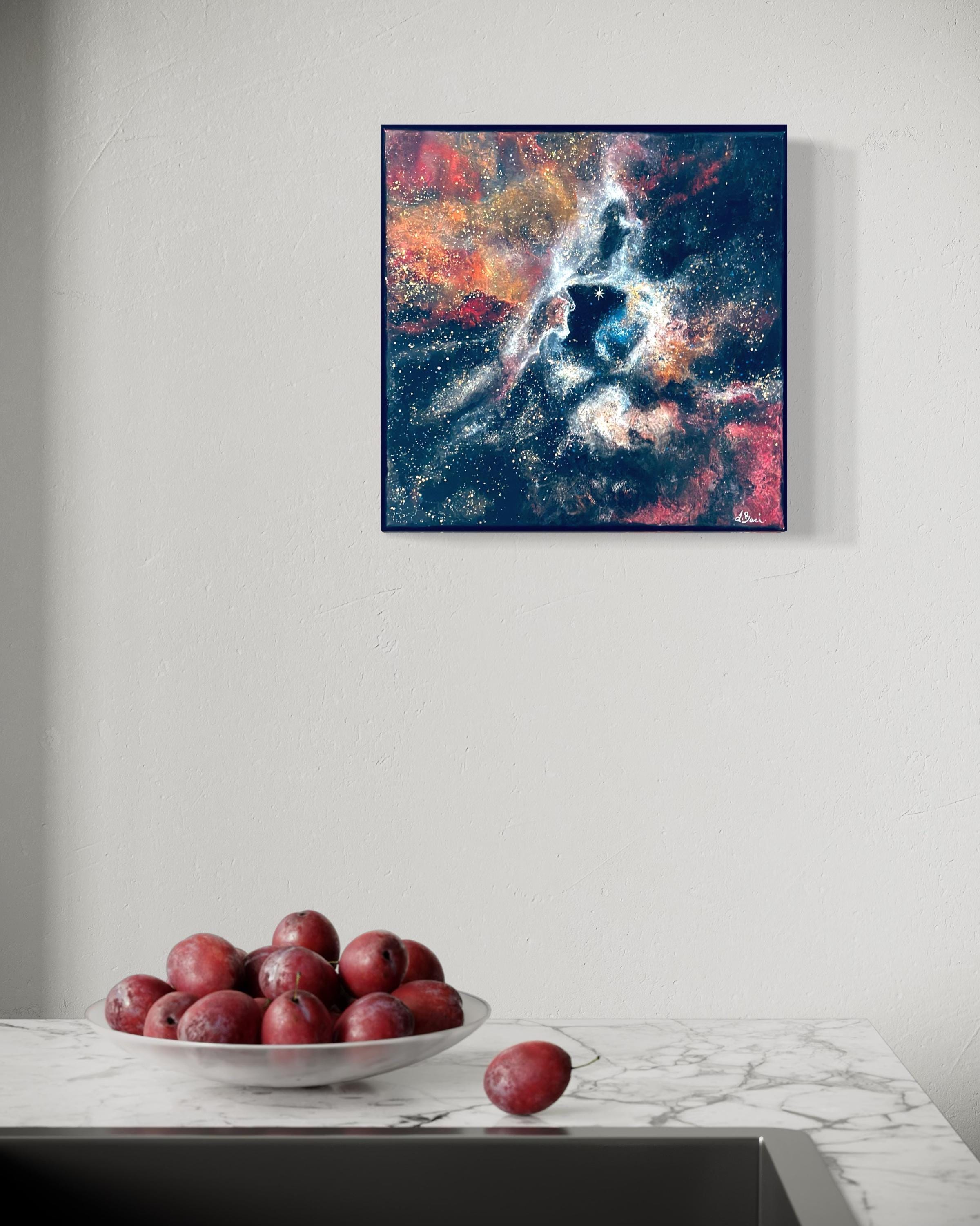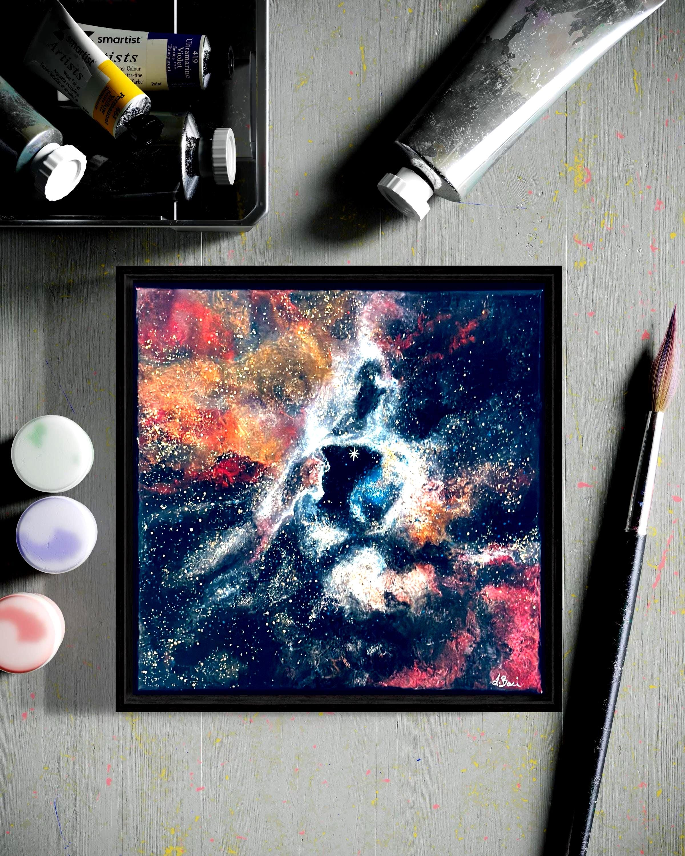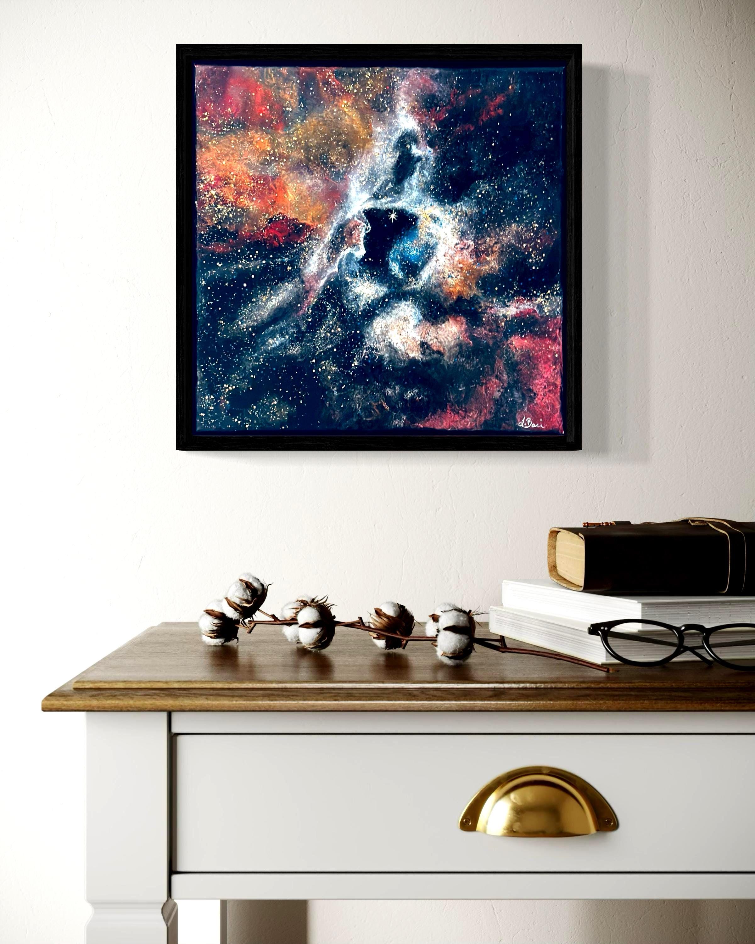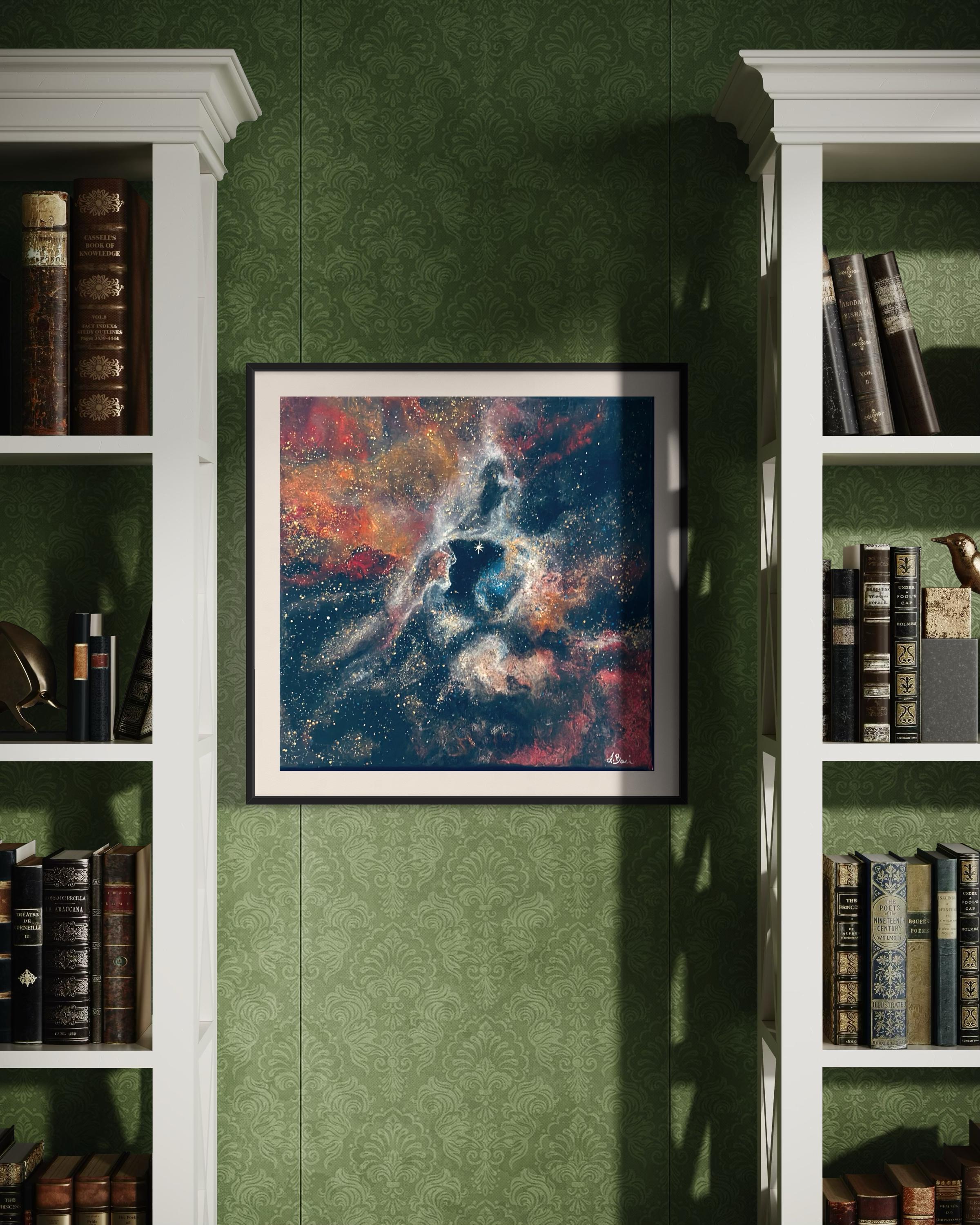 Galaxy Wall Art Print of The Tarantula Nebula, also known as 30 Doradus, lies within an interstellar region, in a molecular cloud where star formation is taking place. This painting feels as though the image is moving with swirling painted colors and gases creating a beautiful dance of movement on the canvas.