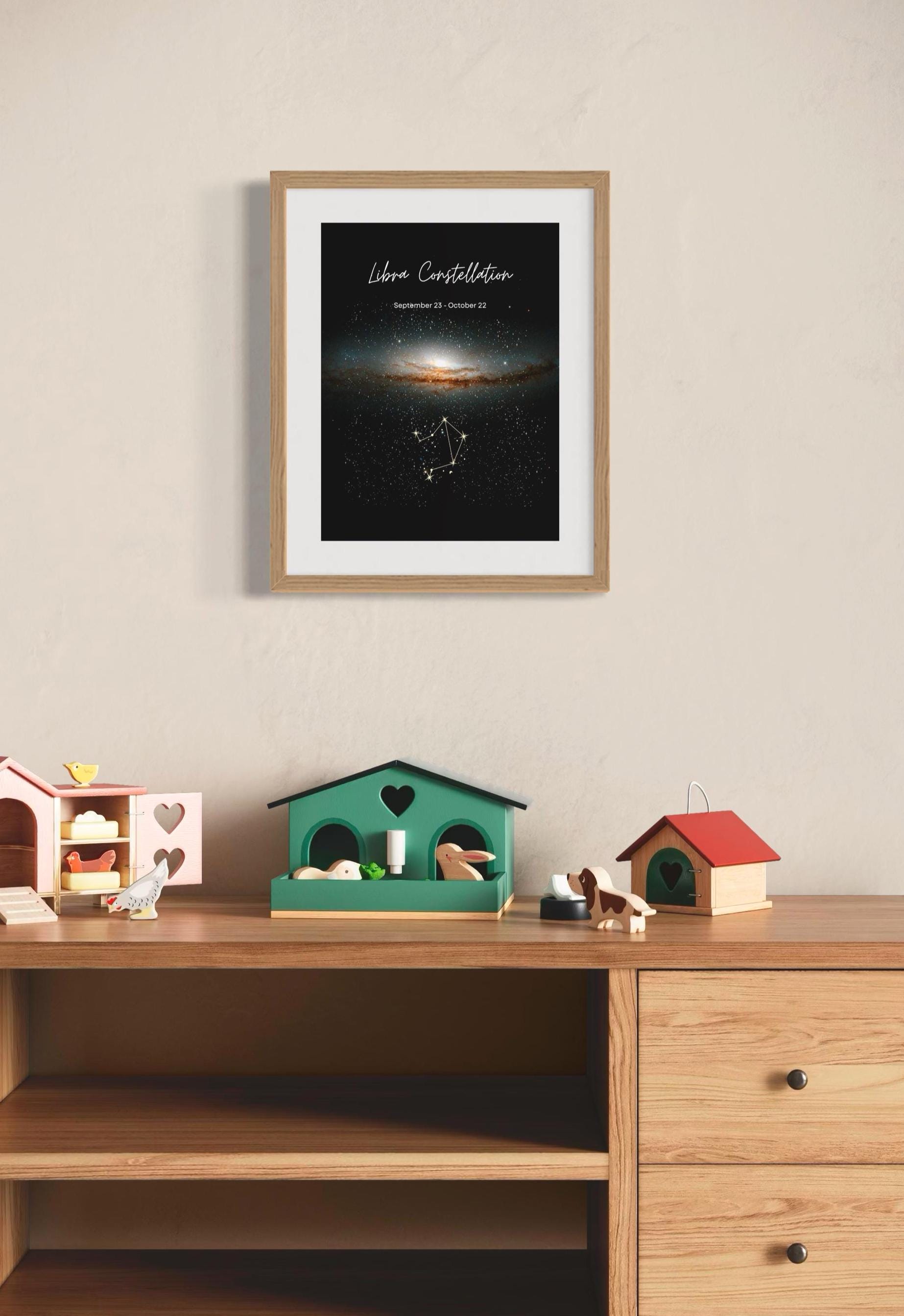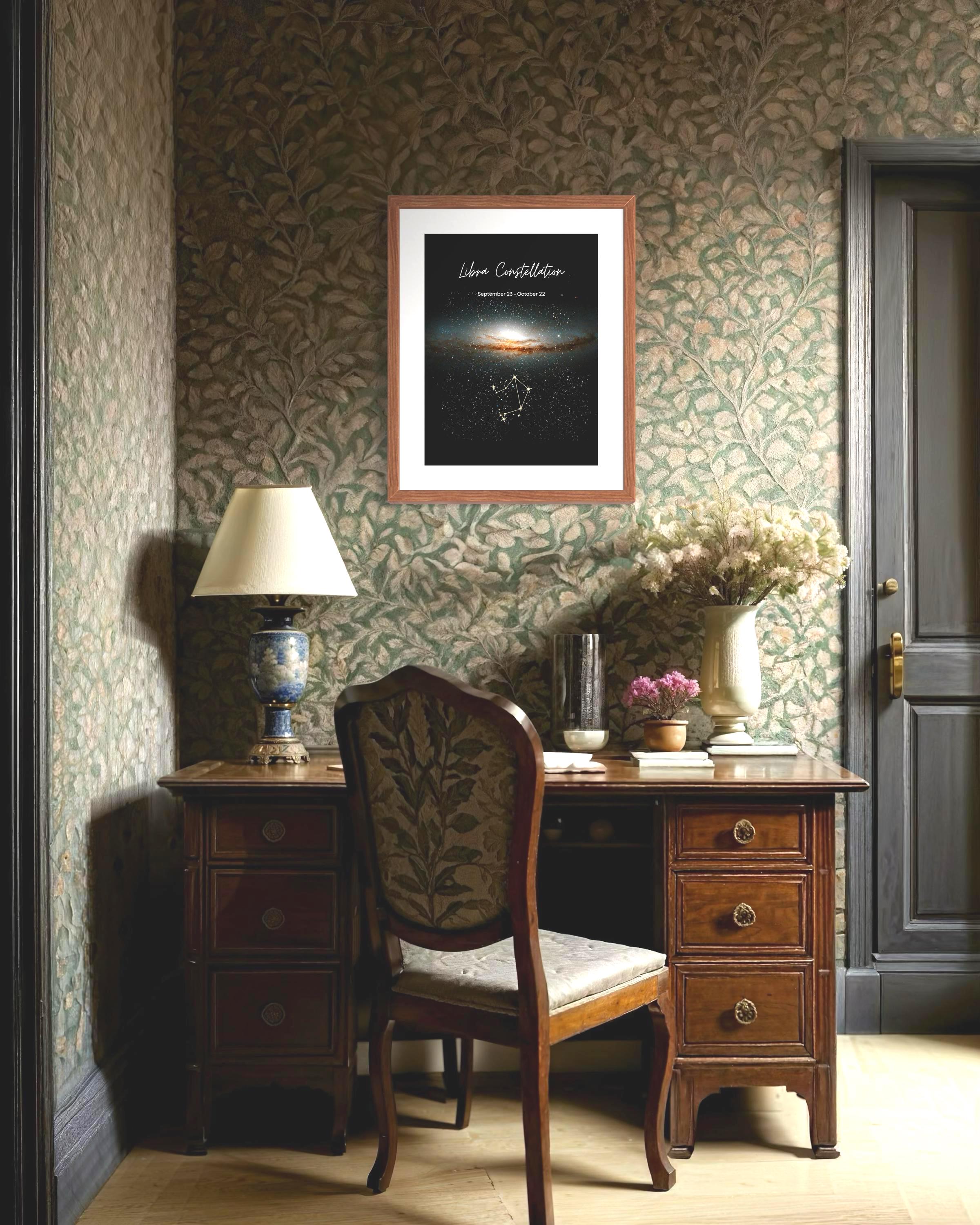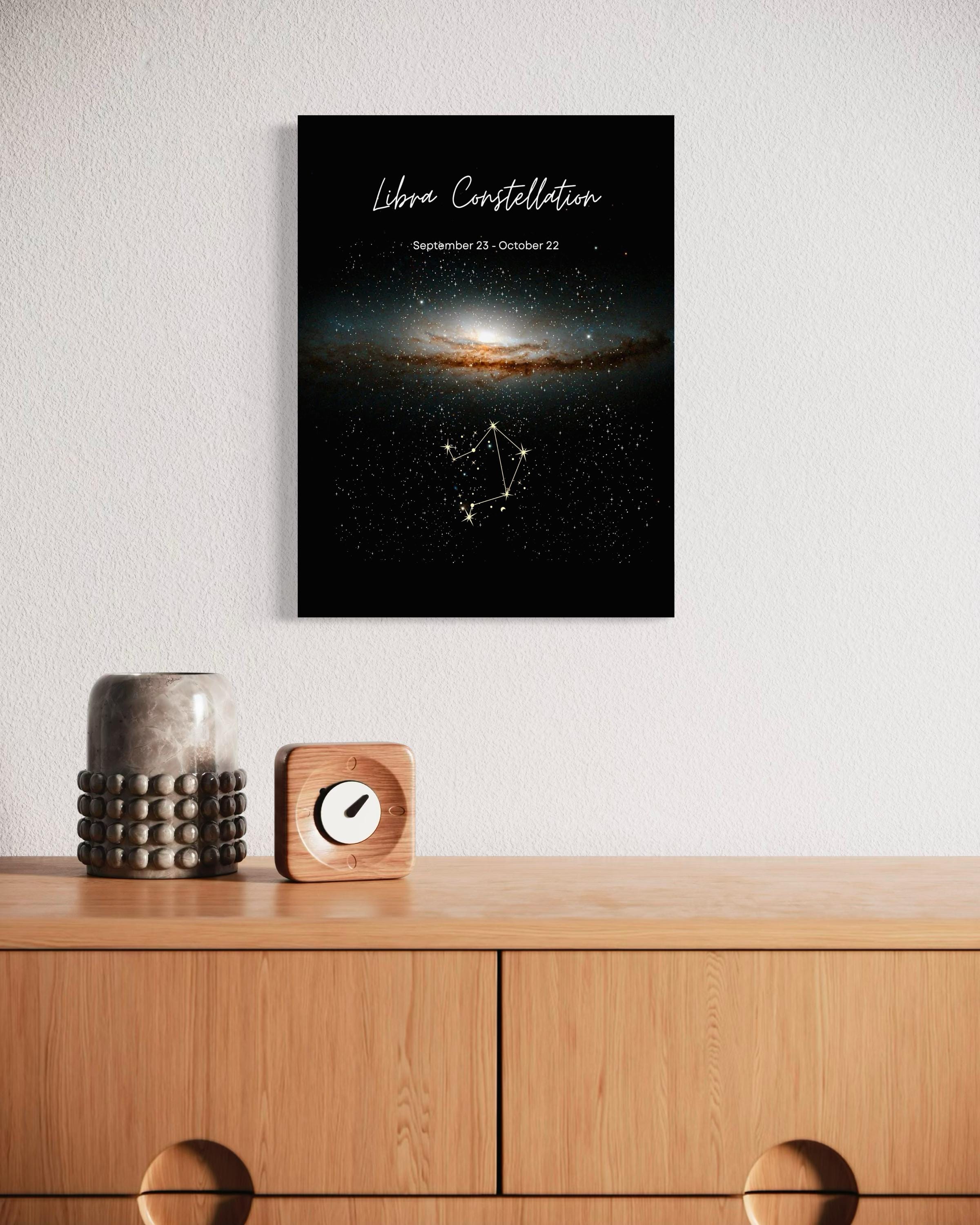 Gallery Poster featuring image captured in Astrological Sign Libra Constellation. NASA discovered NGC 5793, a spiral galaxy over 150 million light-years away in the constellation of Libra. This galaxy has two particularly striking features: a beautiful dust lane and an intensely bright center — much brighter than that of our own galaxy, or indeed those of most spiral galaxies we observe. Libra constellation star pattern embedded in design by real artist, no AI generation, made in US.