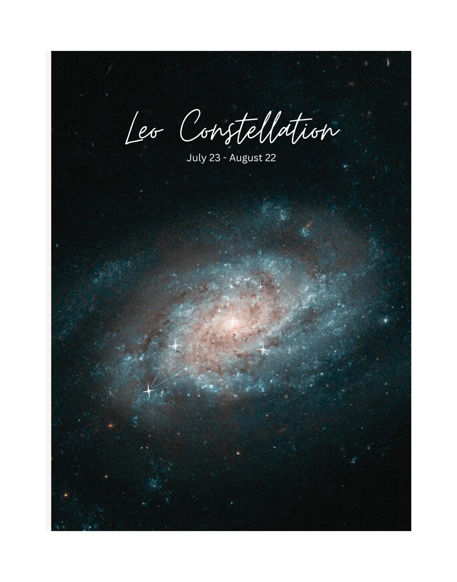 Gallery-quality poster of Astrological Sign Leo featuring NASA’s image from James Webb Space Telescope taken in the Leo Constellation that shows a star-forming located about 5 million light-years away in the constellation Leo. The artist embedded the Leo Zodiac Star Map into the image making it a unique one of kind print, no Ai generated images all made by award winning artist.