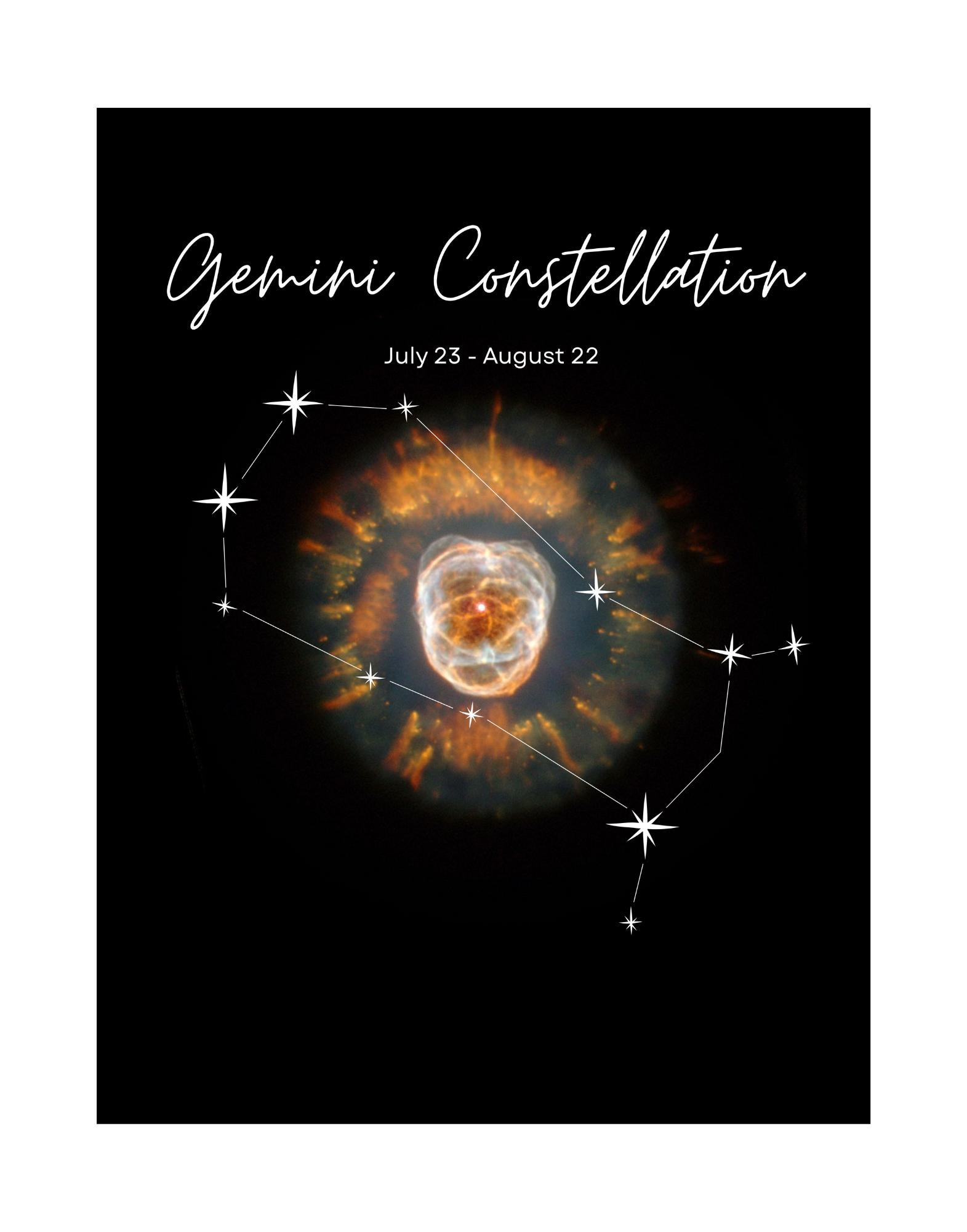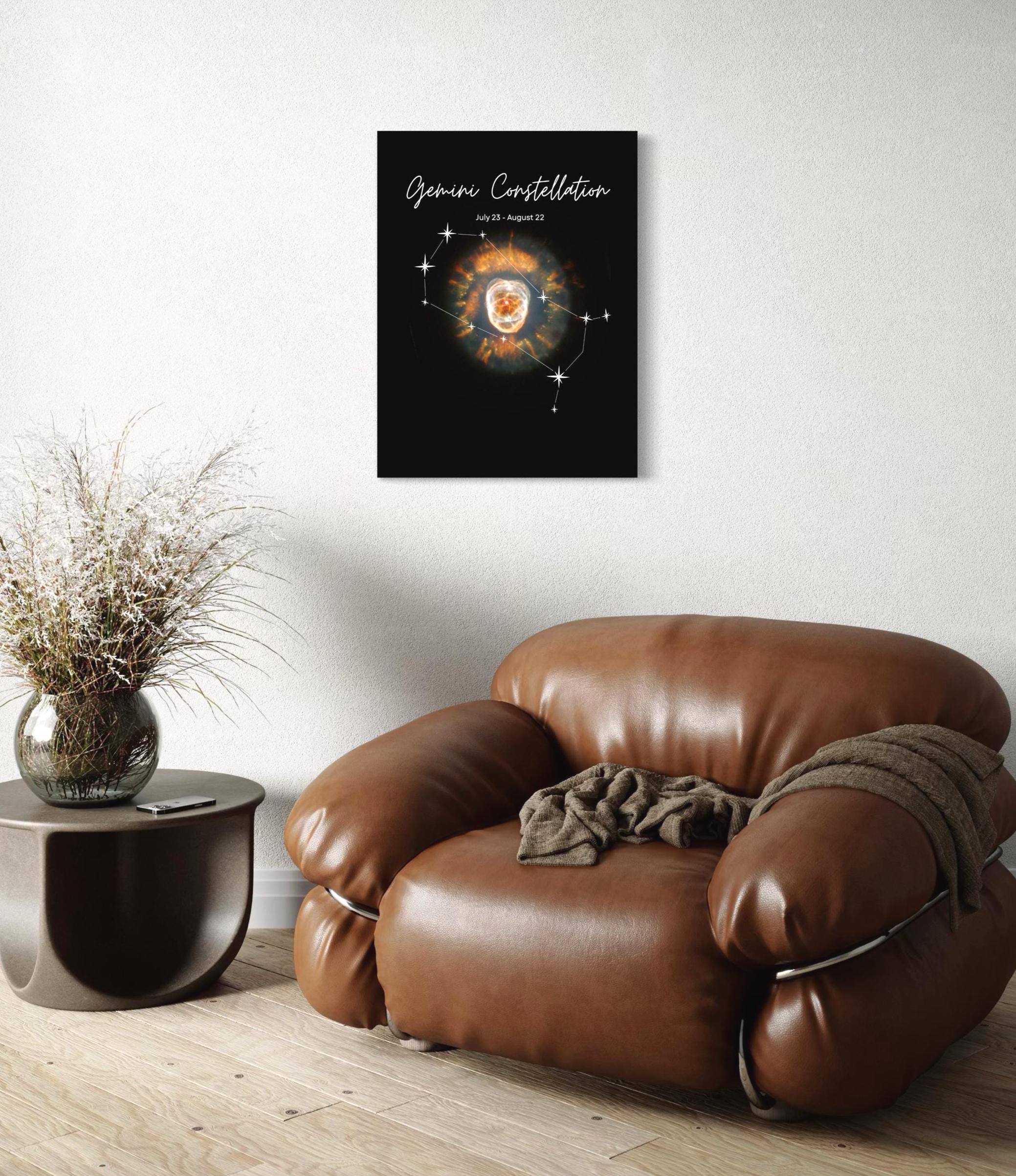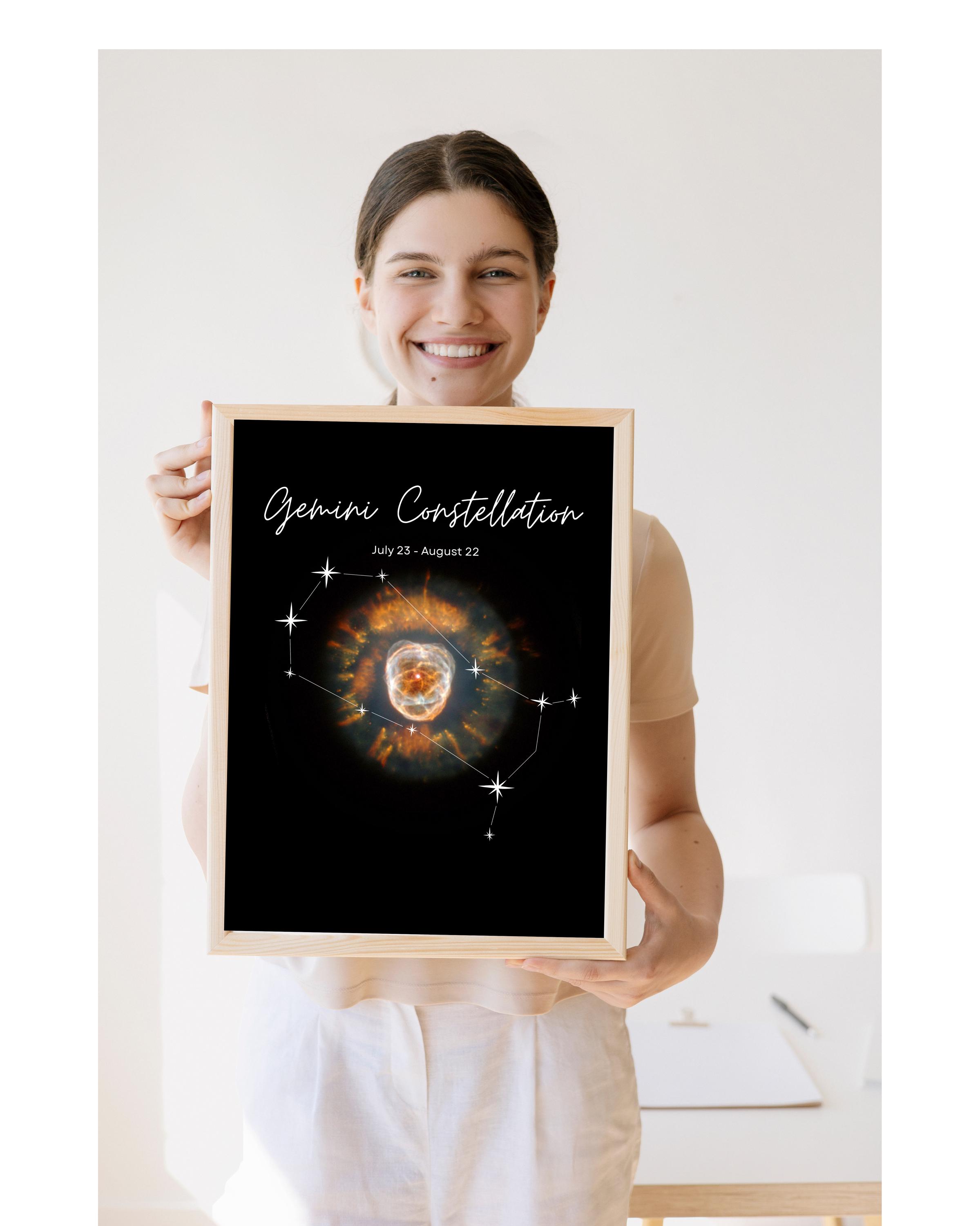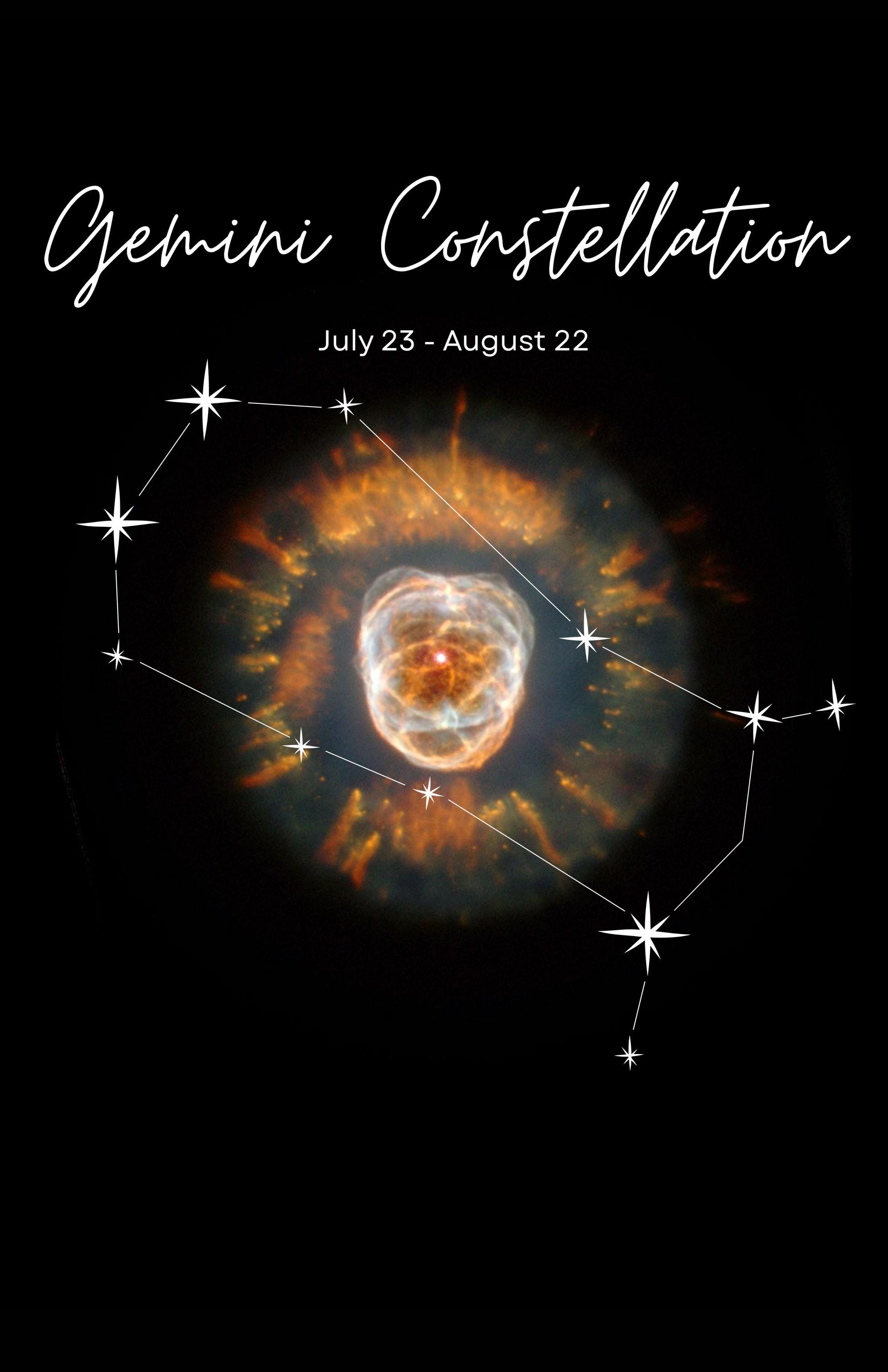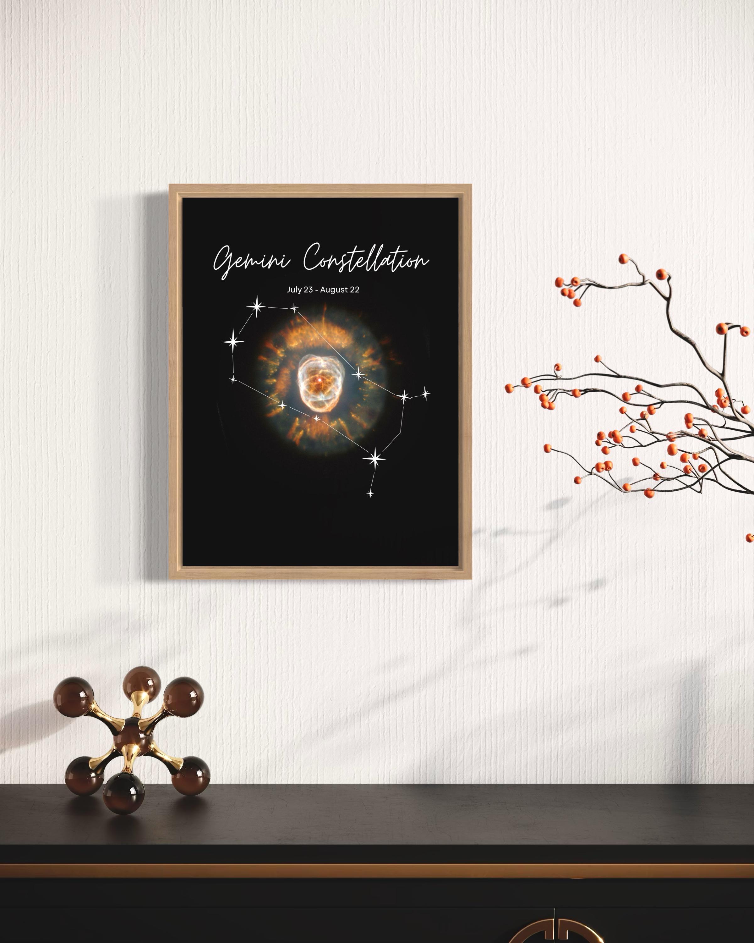 Gallery-quality poster revealing the astrological constellation Gemini displaying NASA image captured by the Hubble Space Telescope in the Gemini Constellation, a majestic view of a planetary nebula, the glowing remains of a dying, star NGC 2392 in Gemini Constellation.