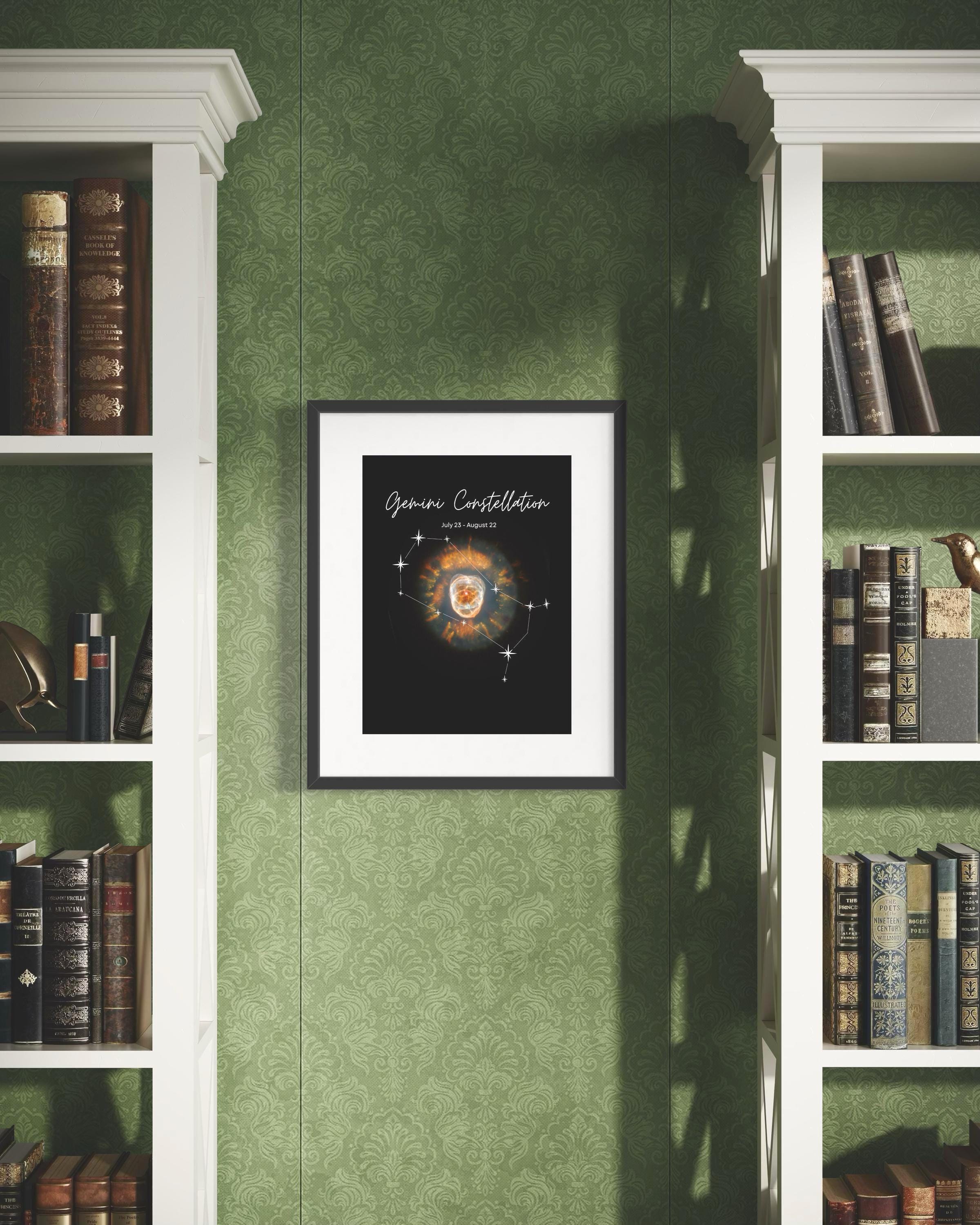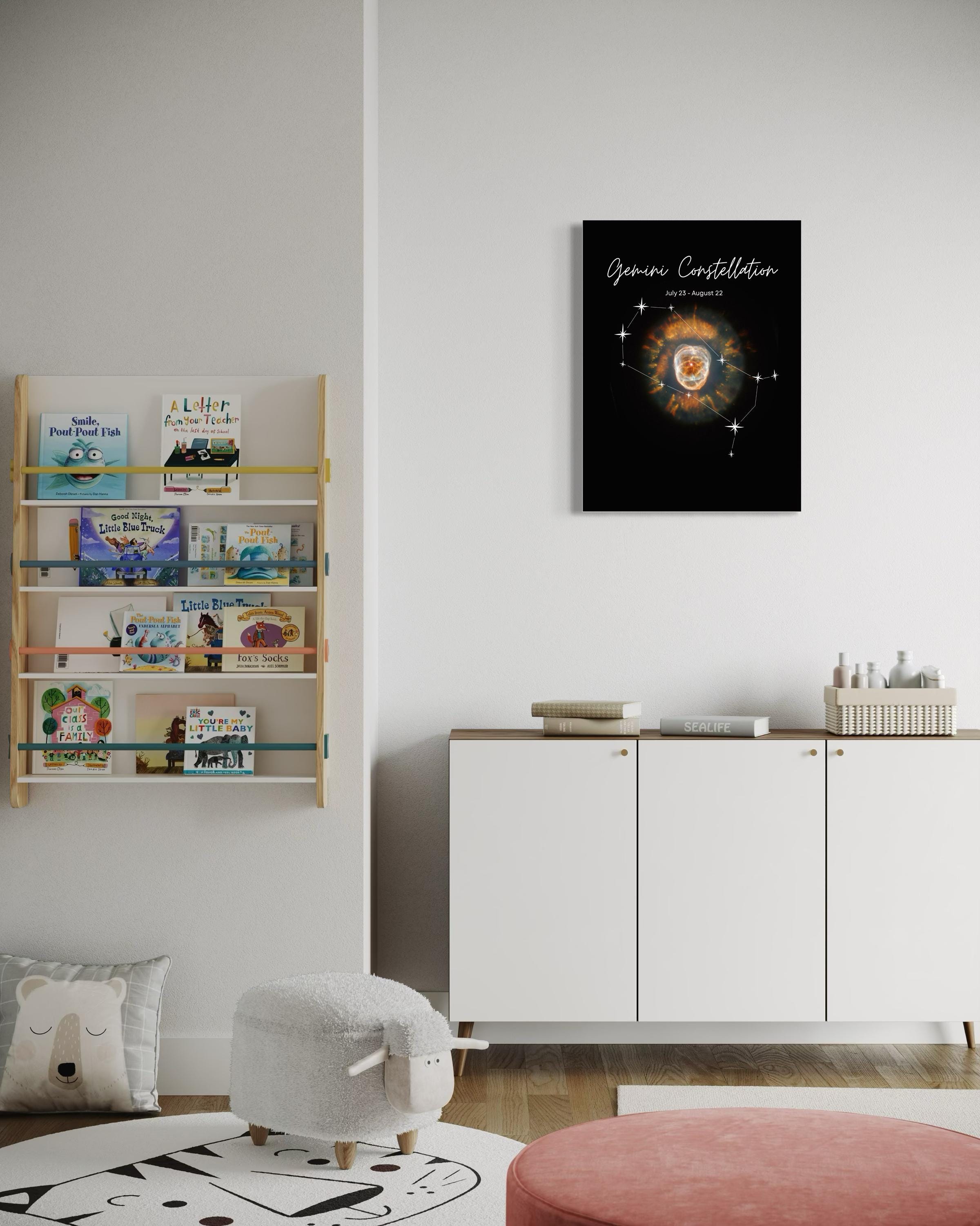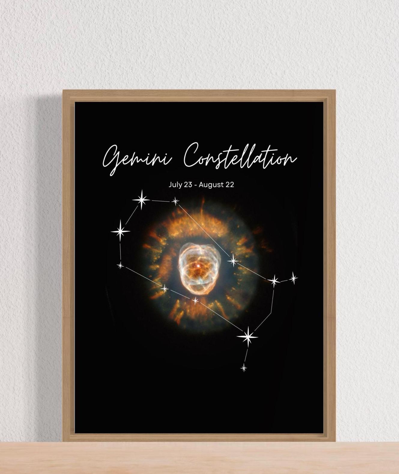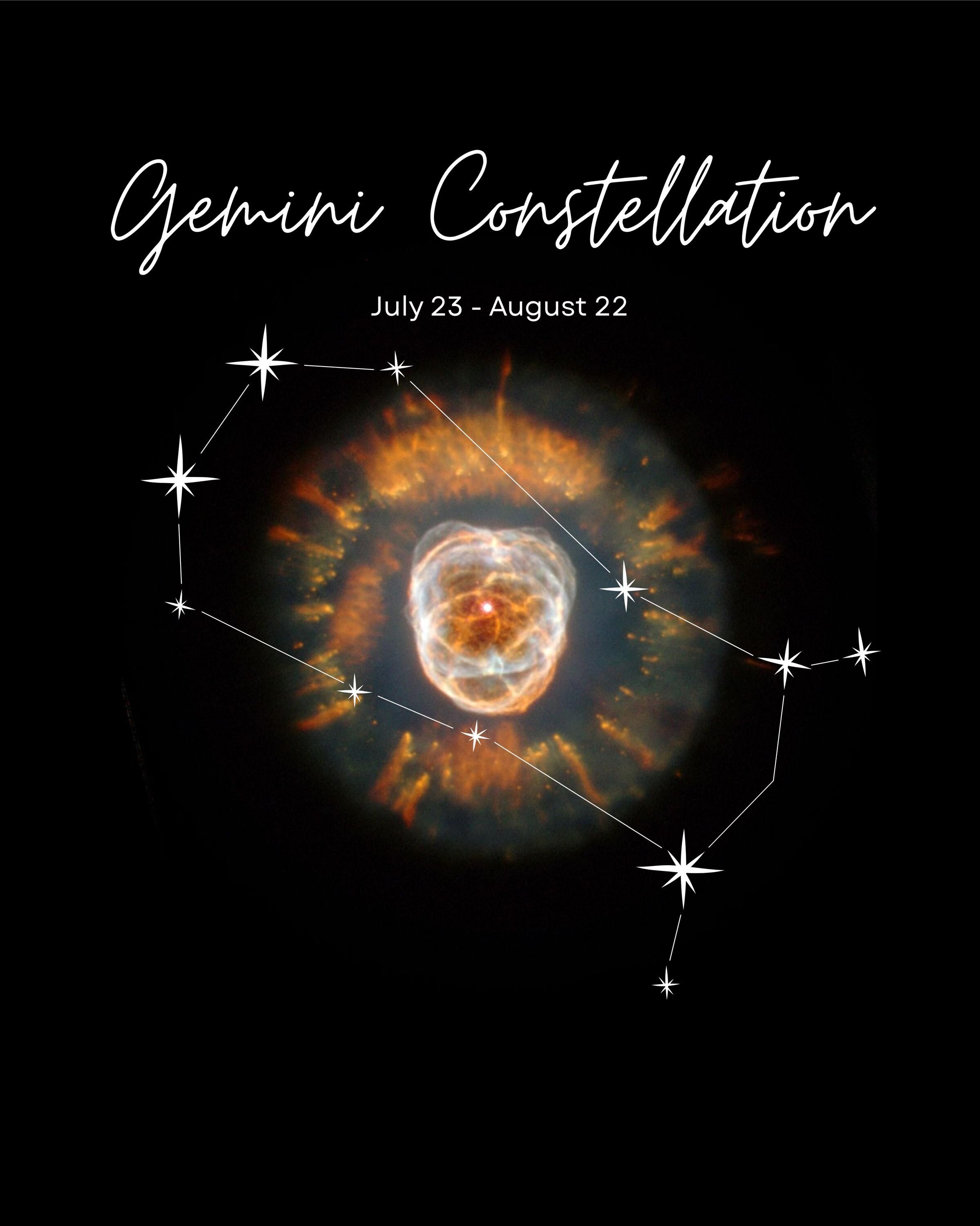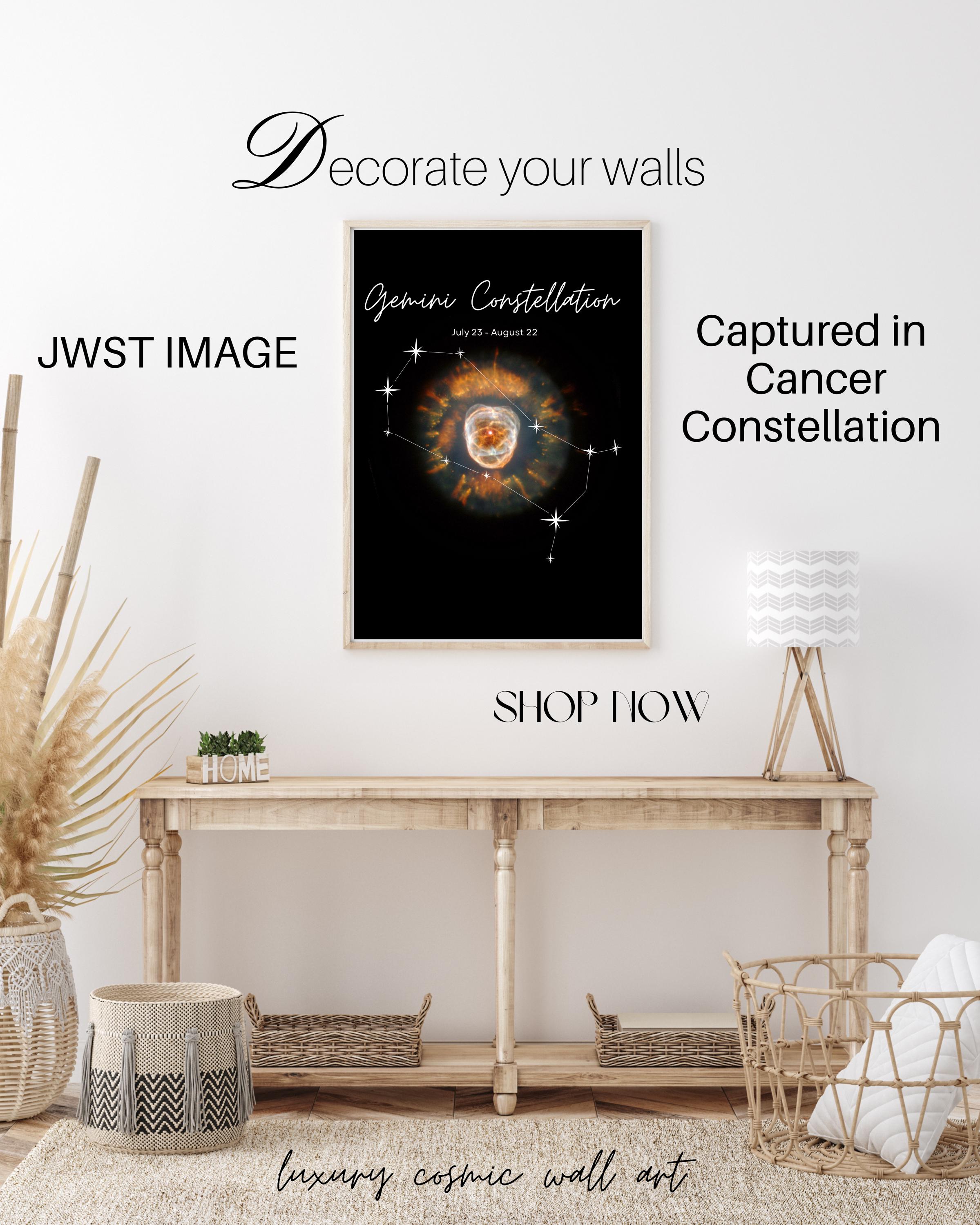 Gallery-quality poster revealing the astrological constellation Gemini displaying NASA image captured by the Hubble Space Telescope in the Gemini Constellation, a majestic view of a planetary nebula, the glowing remains of a dying, star NGC 2392 in Gemini Constellation.