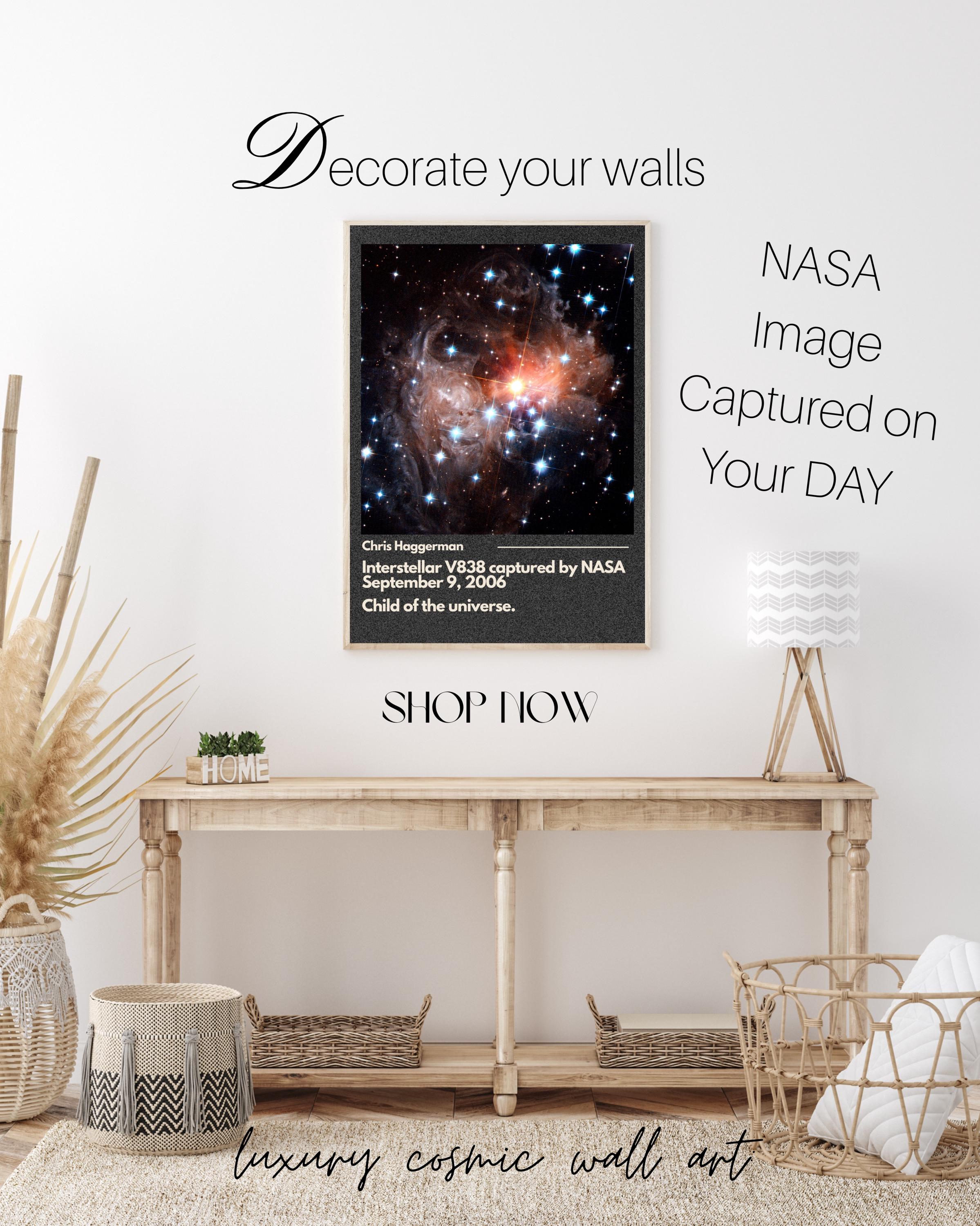 NASA’s telescope images are among the most searched in the world — now you can bring one of them into your space in a meaningful, personalized way.Gallery-quality print displaying NASA's image taken on your selected day. Name and date with title of NASA image customized on each print, created by a real artist.