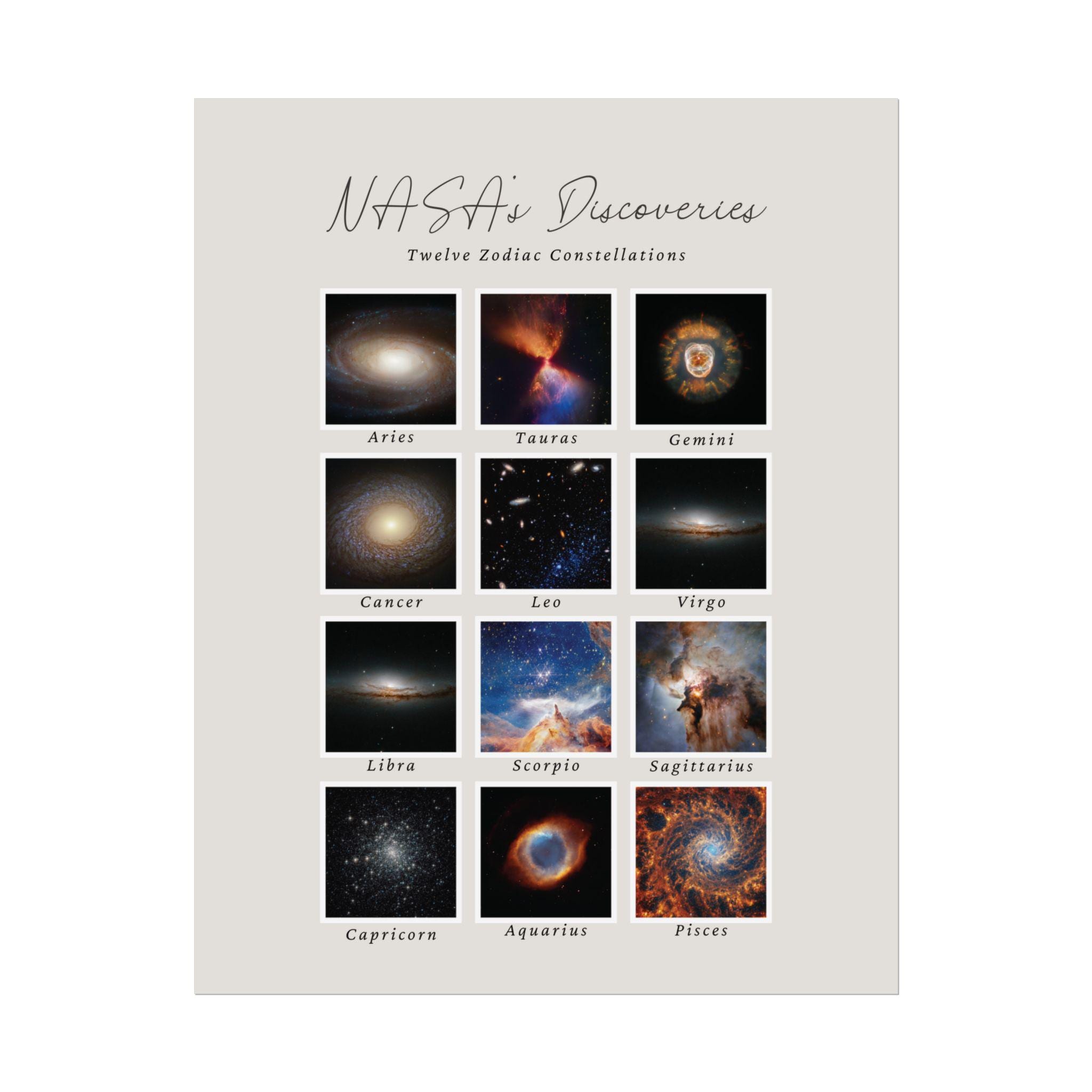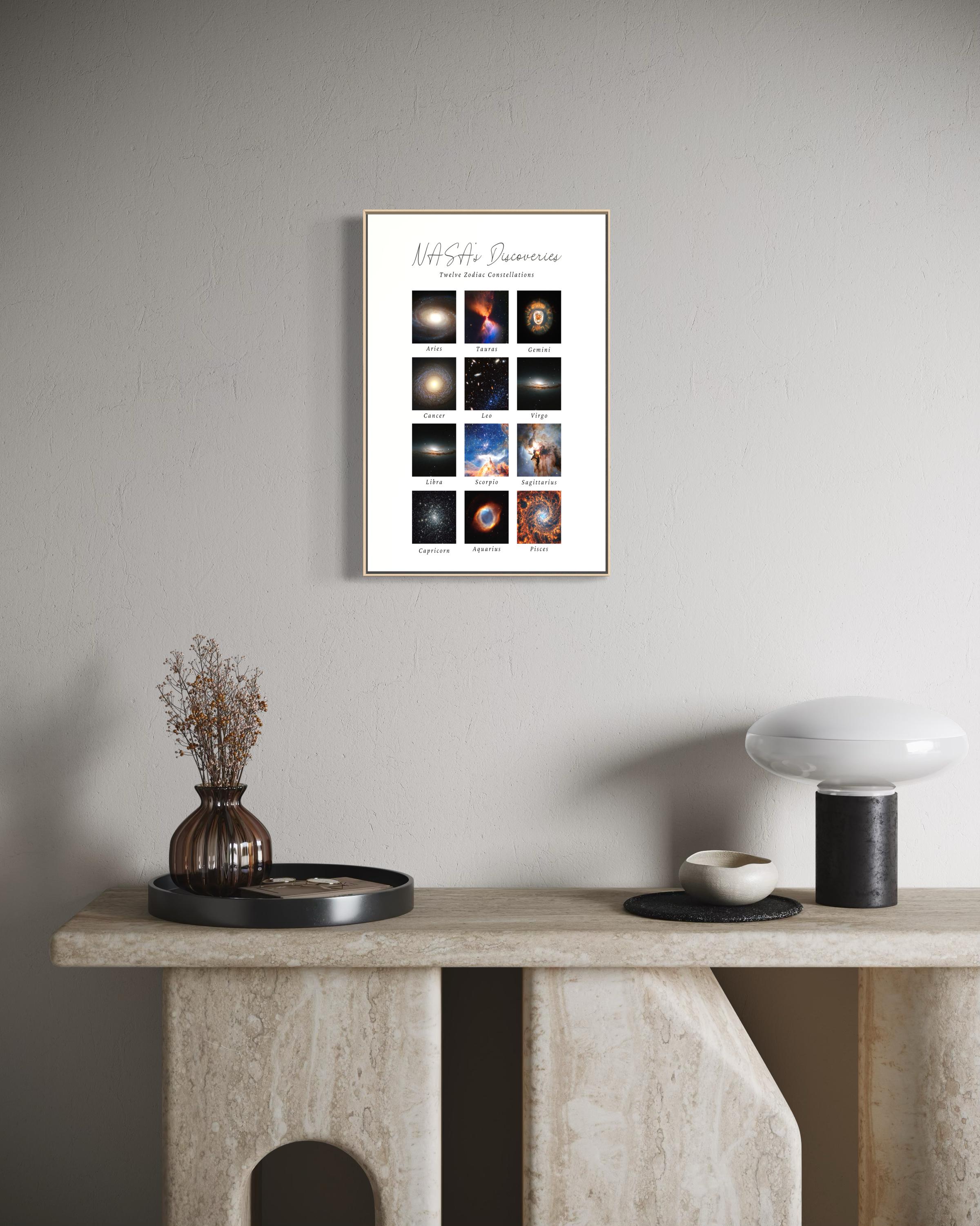 Transform your space with these stunning Gallery Poster, showcasing a mesmerizing collection of NASA's discoveries in zodiac constellations. Each piece is designed to inspire awe and curiosity, perfect for the space enthusiast or anyone who appreciates the beauty of the cosmos. These posters evoke a sense of wonder and make ideal decorations for bedrooms, studies, or even offices. They're perfect for adults looking to elevate their decor, making them great gifts for holidays like Christmas, birthdays, or any celebration for those who enjoy astronomy. With options for horizontal and vertical displays, there's a perfect fit for any space.