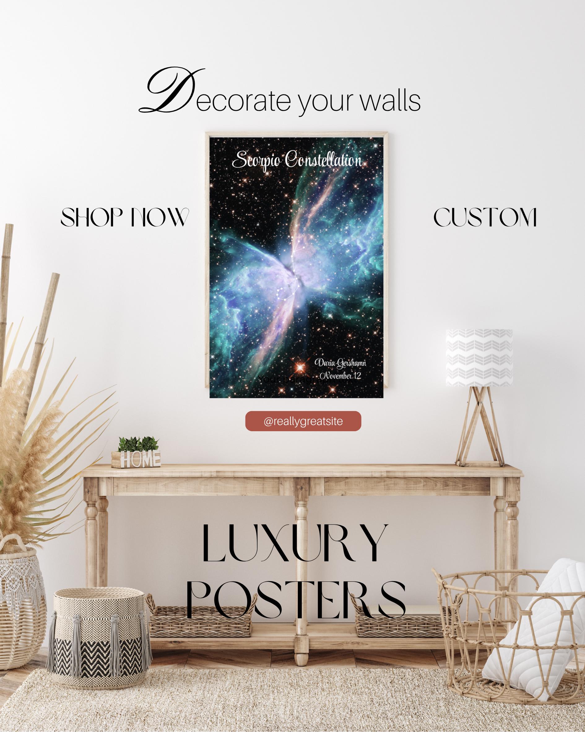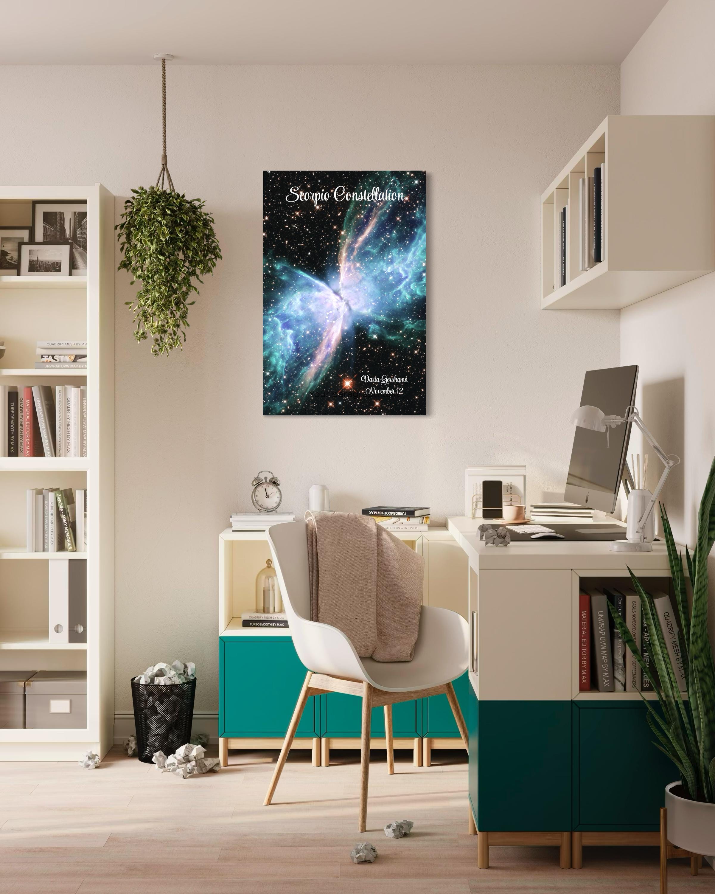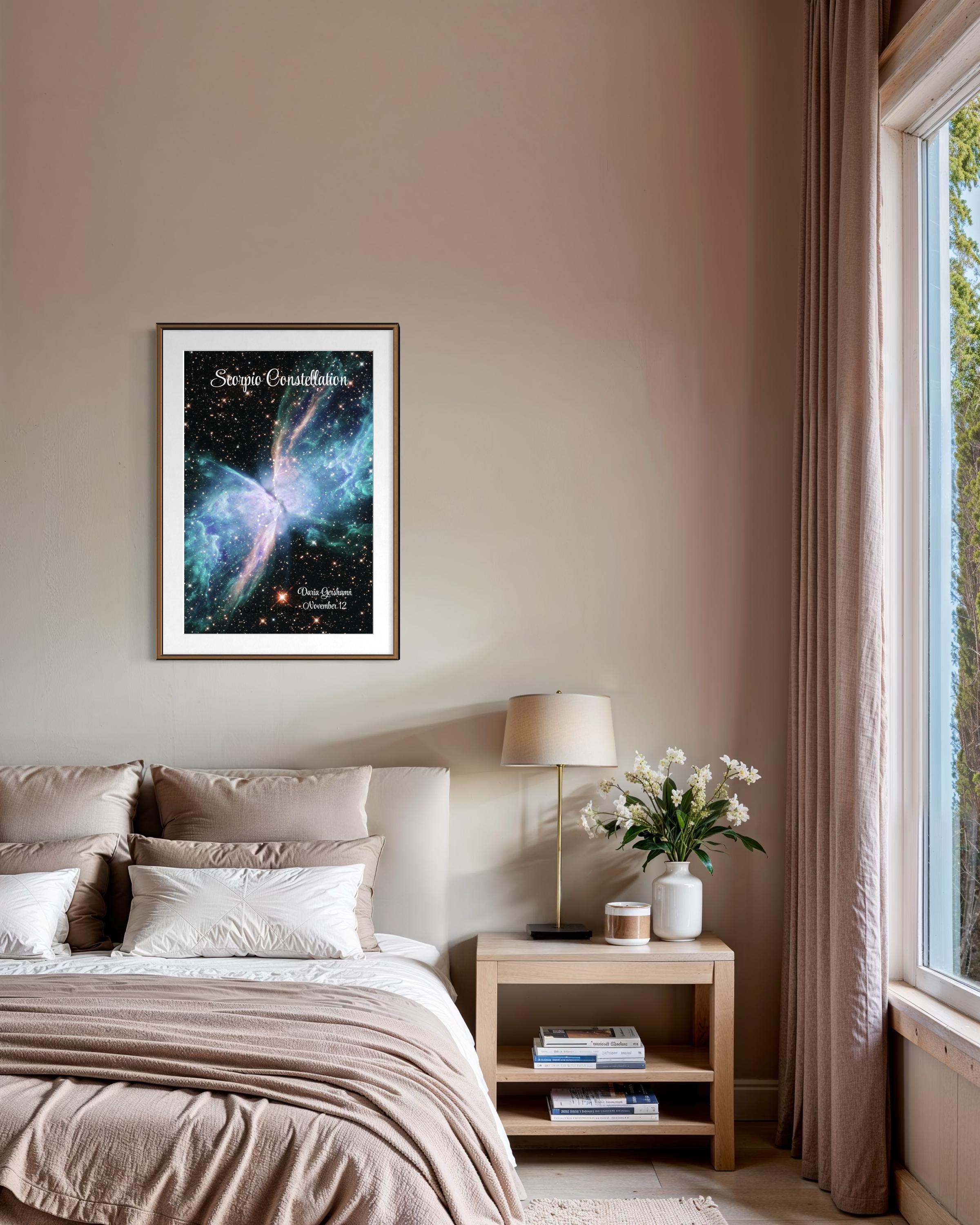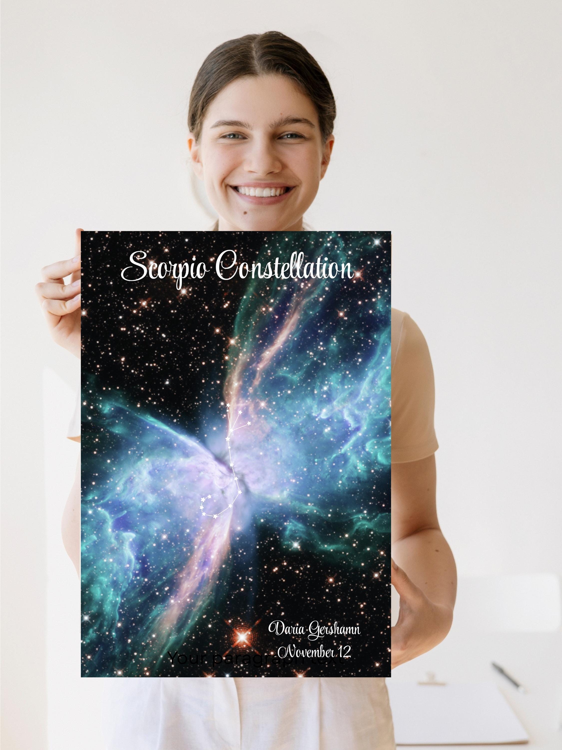 Personalized luxury poster with image from Astrological Constellation Scorpius, featuring stunning new image of the Butterfly Nebula, NGC 632 located in the constellation Scorpius. Each design is created by a real artist and has the embedded star map of that Zodiac constellation, no AI generated images, made in US, by award winning artist.