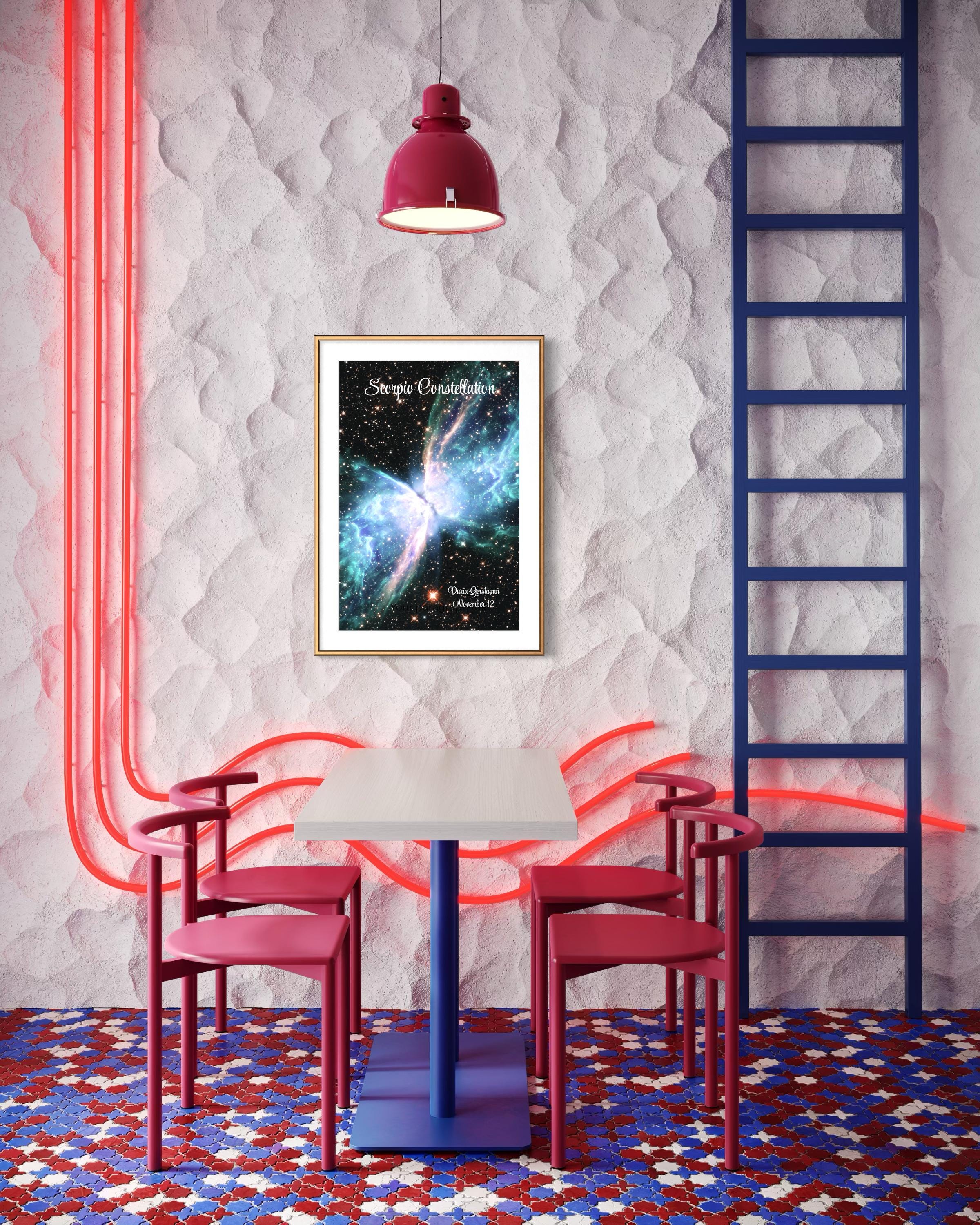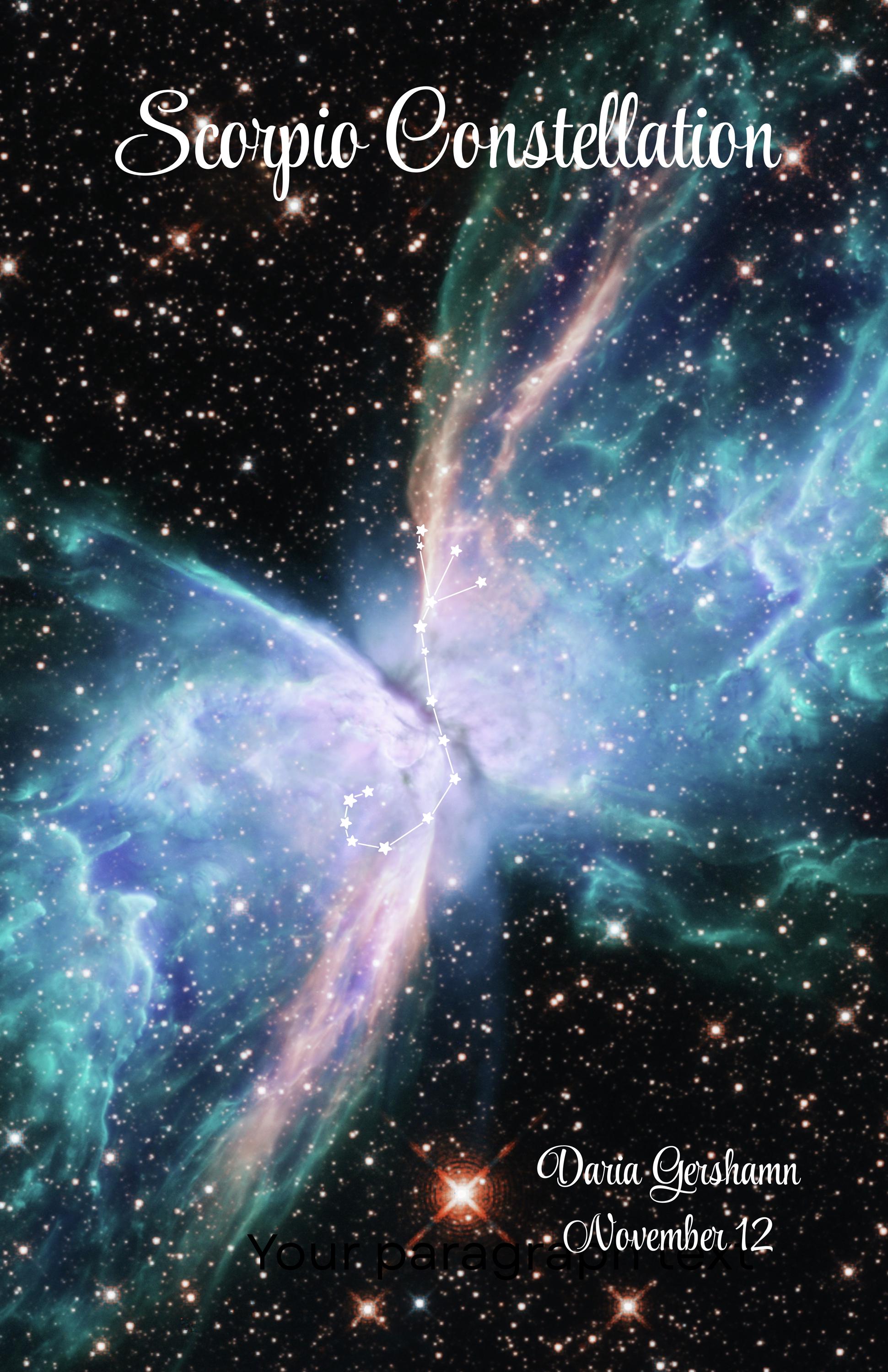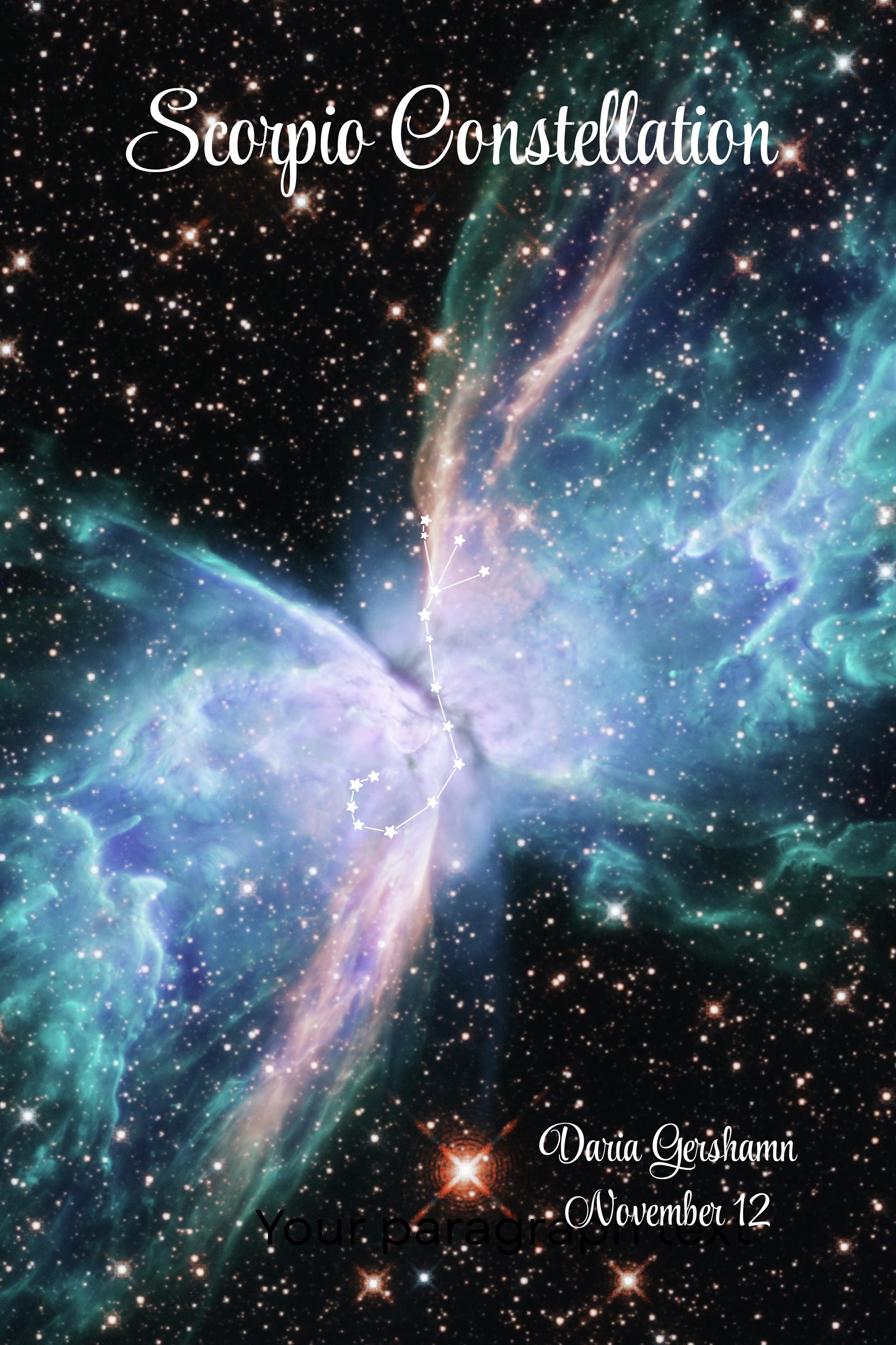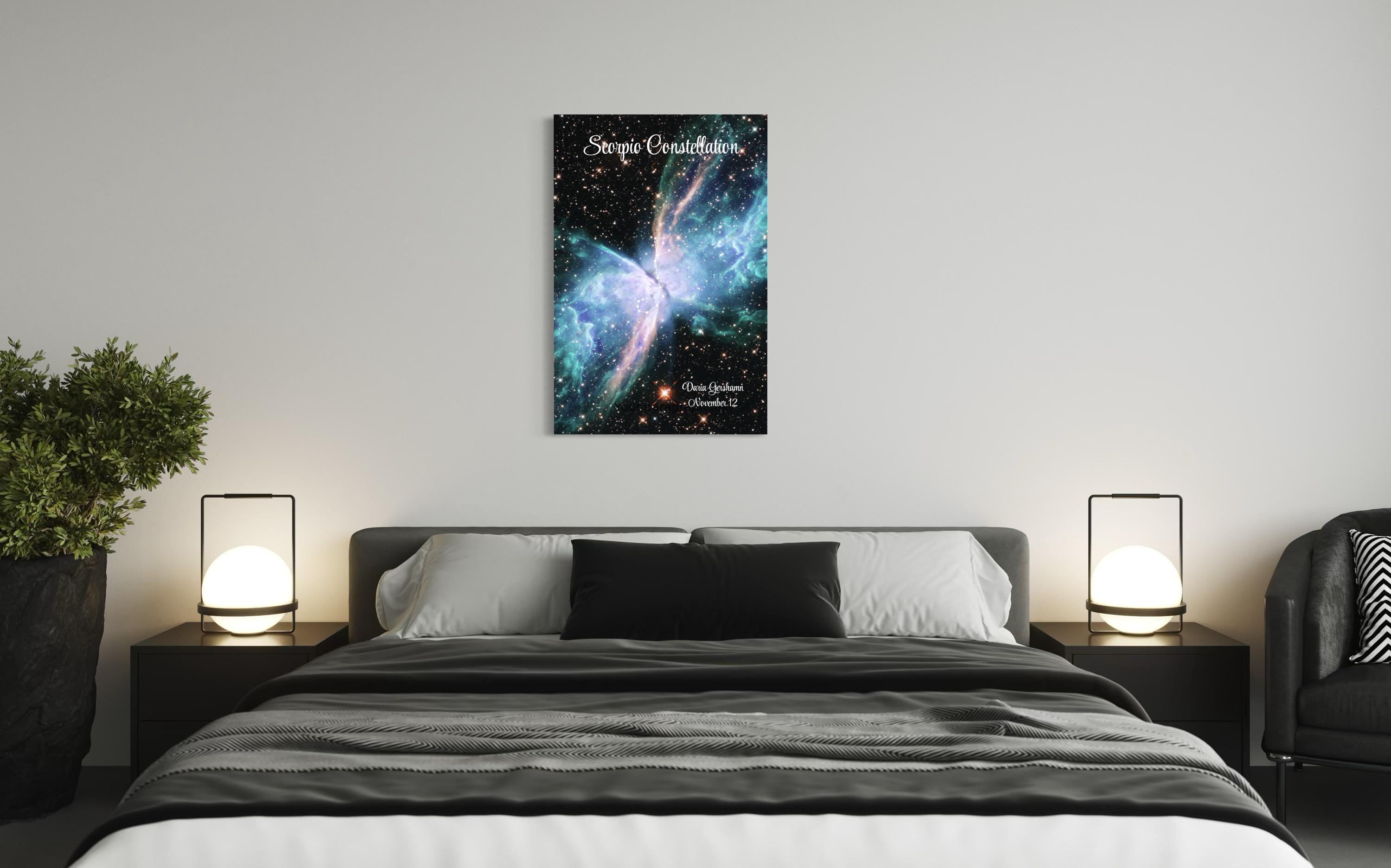 Personalized luxury poster with image from Astrological Constellation Scorpius, featuring stunning new image of the Butterfly Nebula, NGC 632 located in the constellation Scorpius. Each design is created by a real artist and has the embedded star map of that Zodiac constellation, no AI generated images, made in US, by award winning artist.